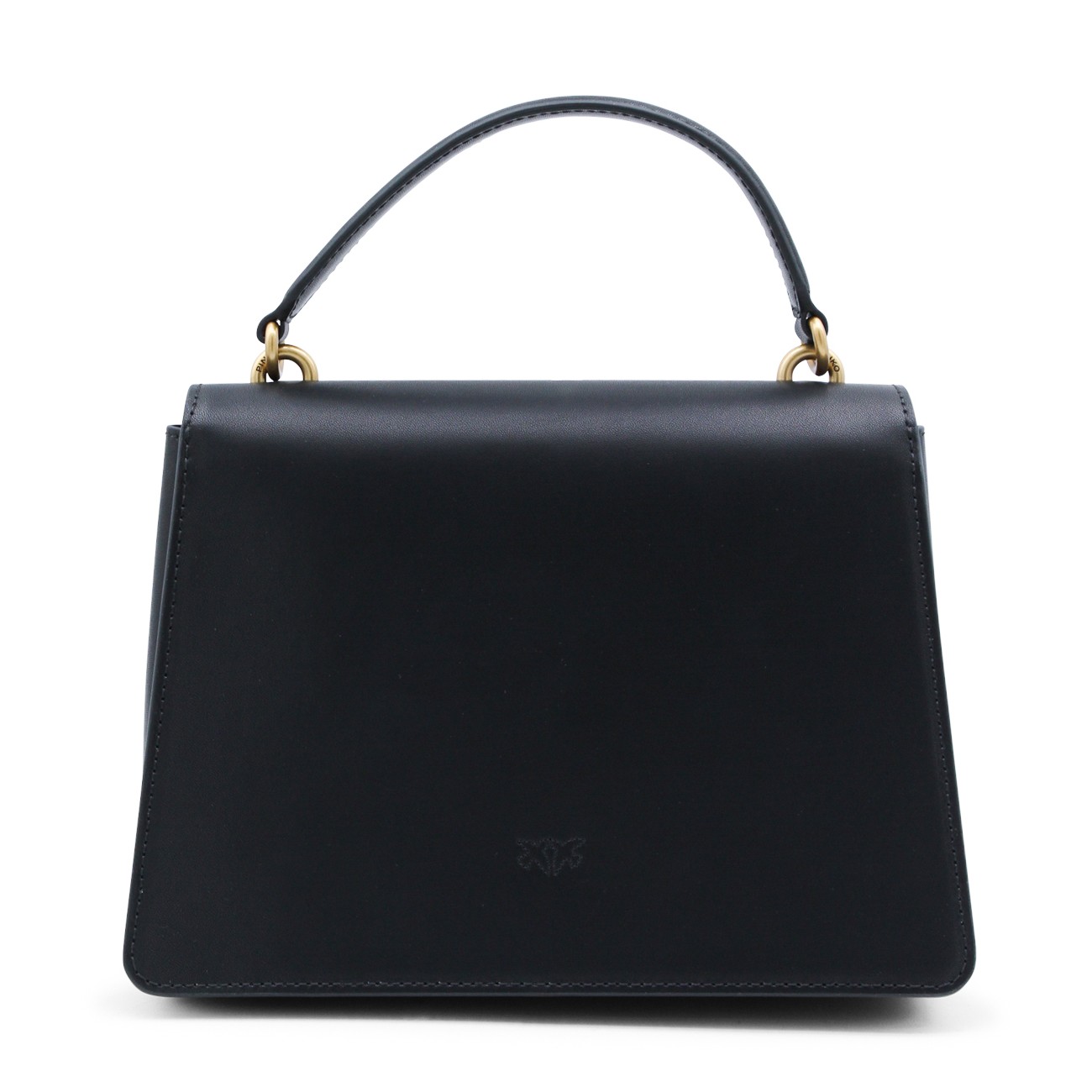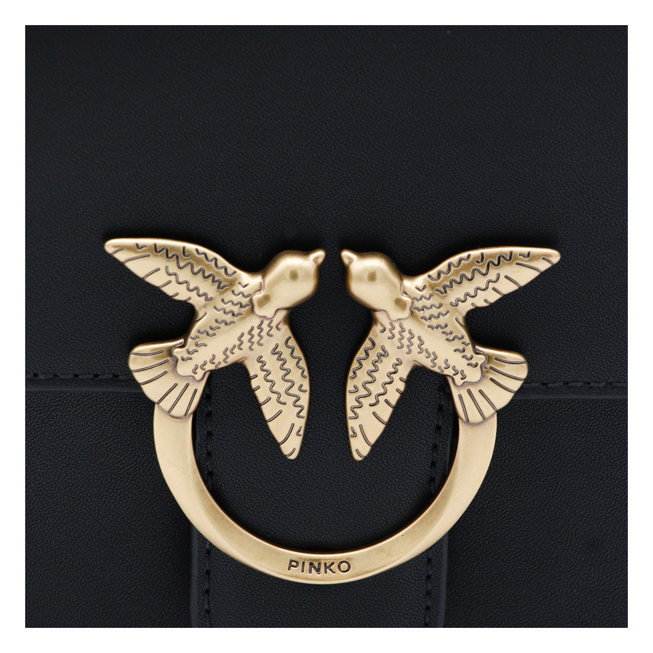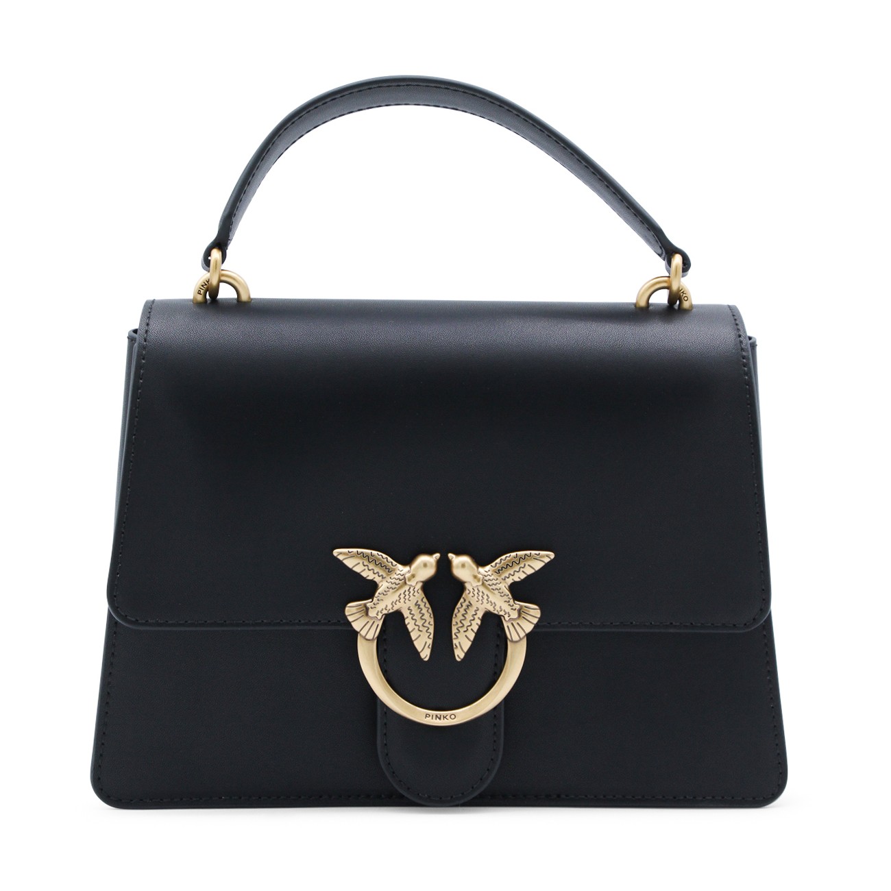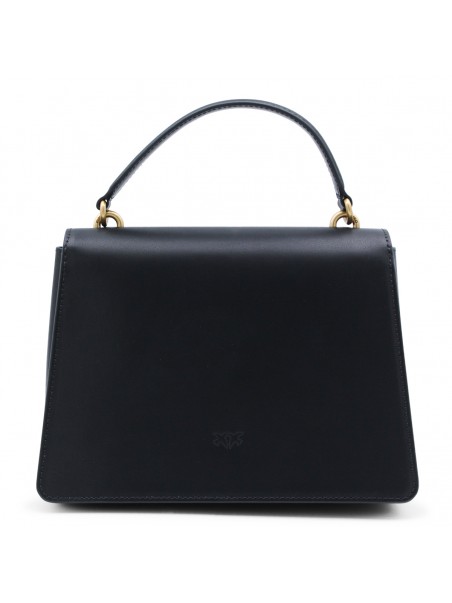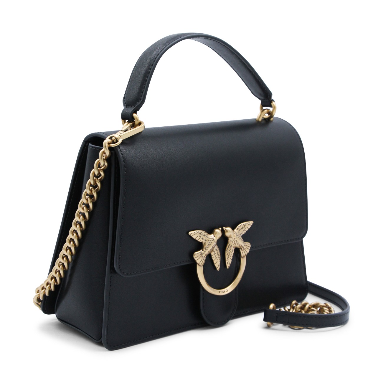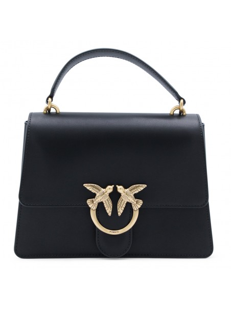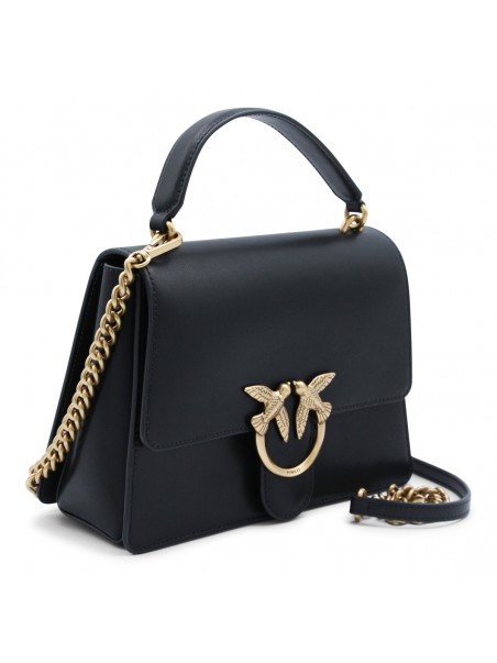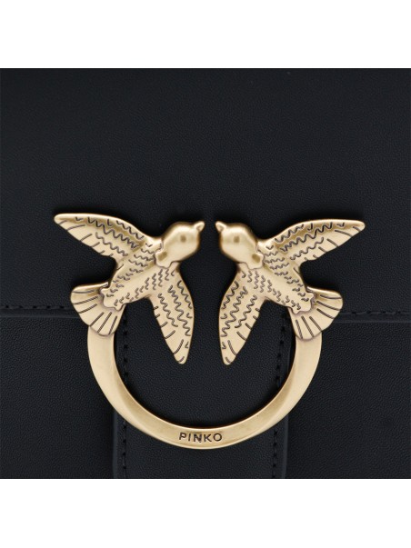 Black leather Love Birds shoulder bag from Pinko featuring gold-tone hardware, signature Love Birds buckle, single flat top handle, detachable shoulder strap, foldover top with magnetic fastening, internal zip-fastening pocket, full lining and main compartment.