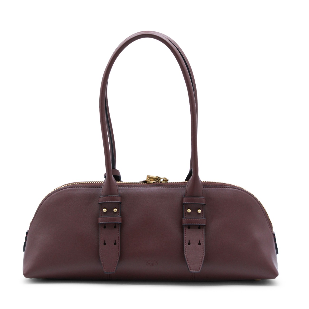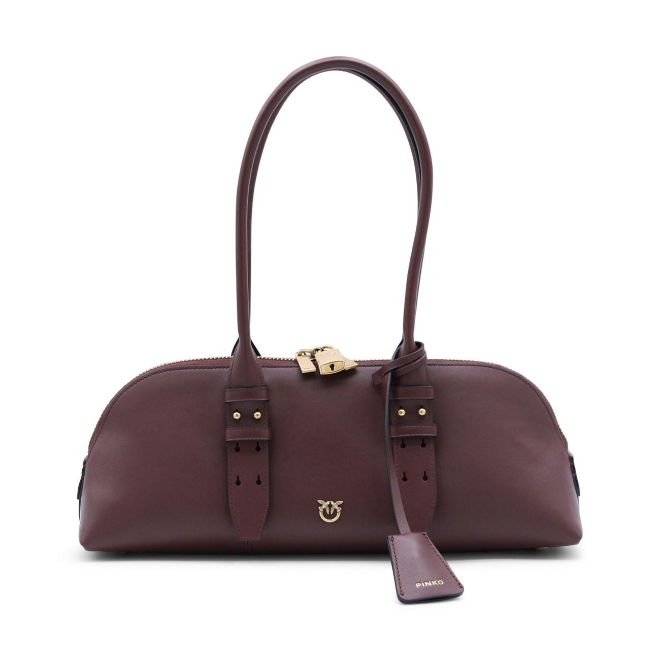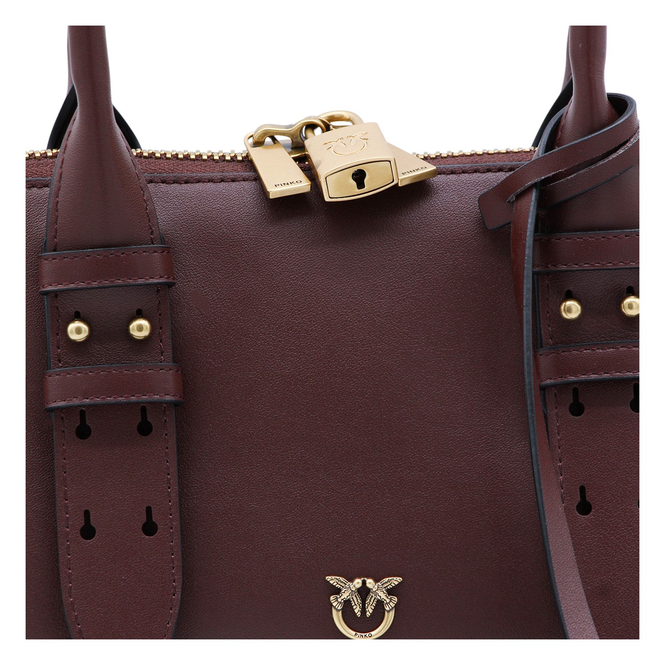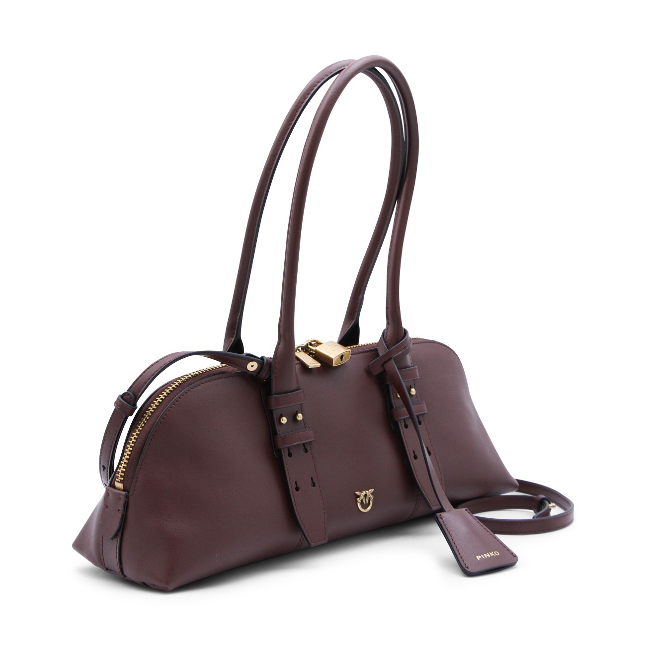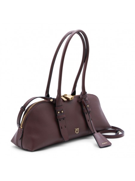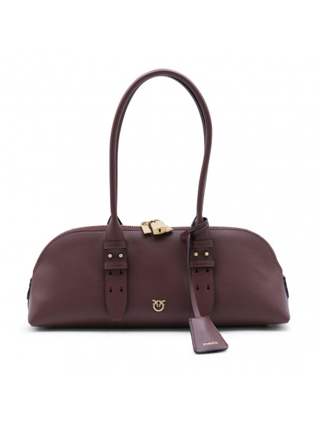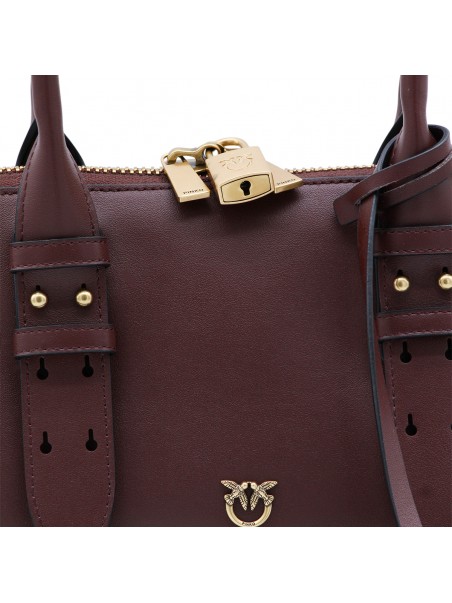 Burgundy leather Escape top handle bag from Pinko featuring top handles, adjustable shoulder strap, top double-slider zip closure, logo padlock, wall pocket, card holder, frontal logo, gold tone hardware and key charm.