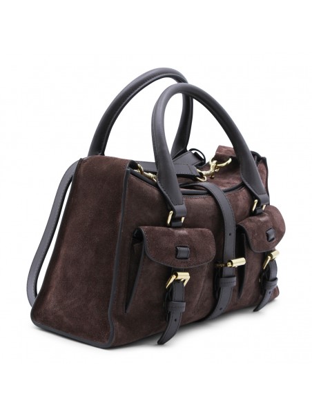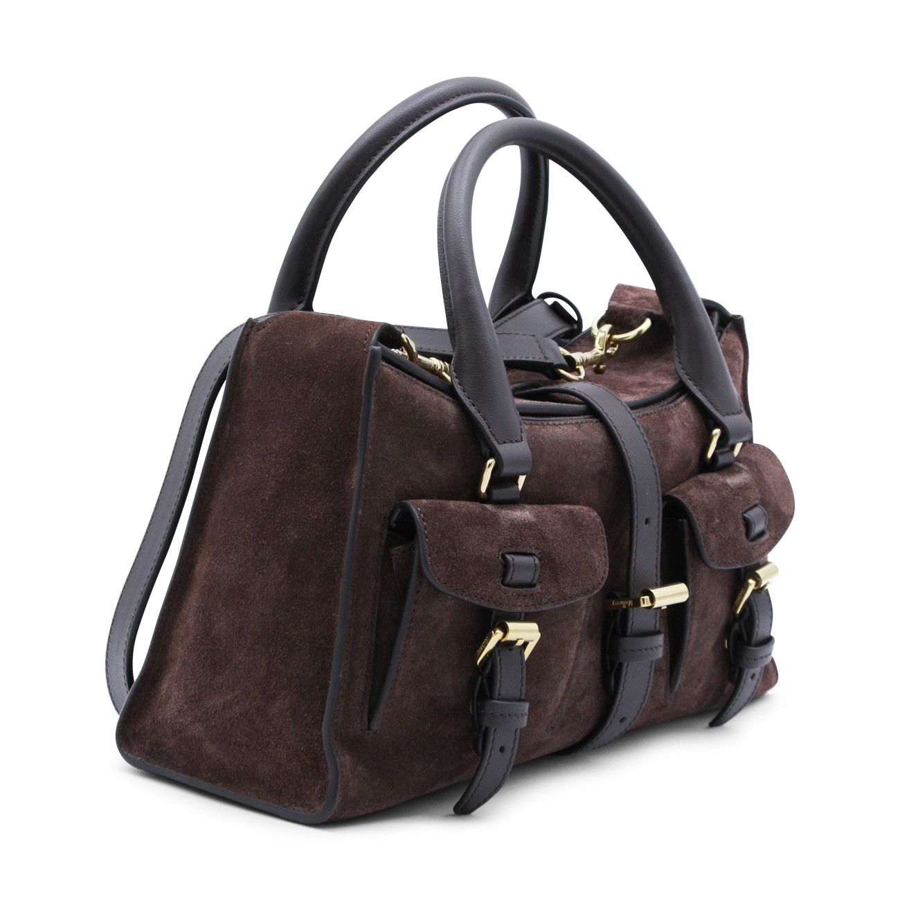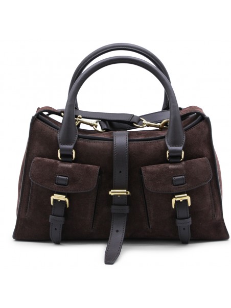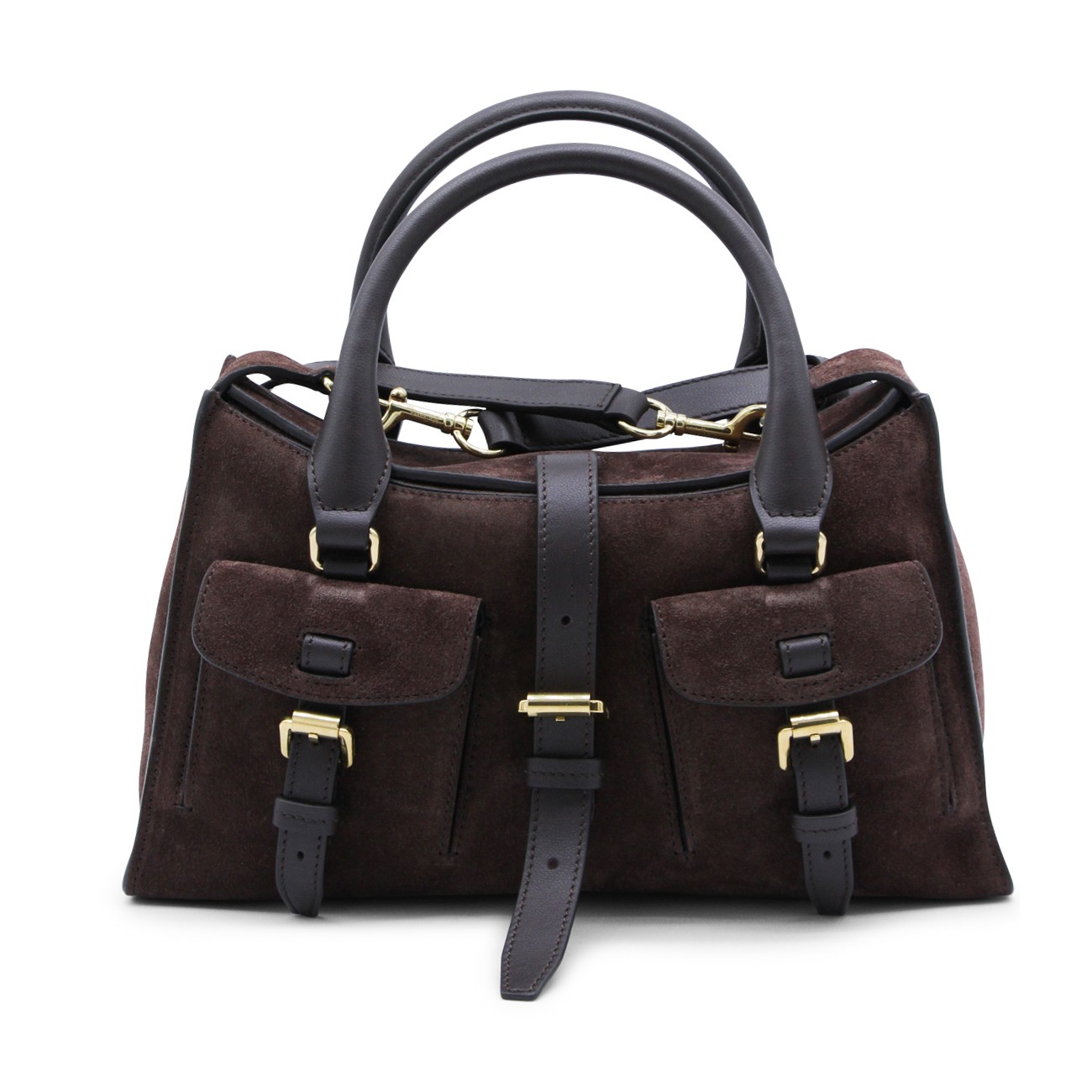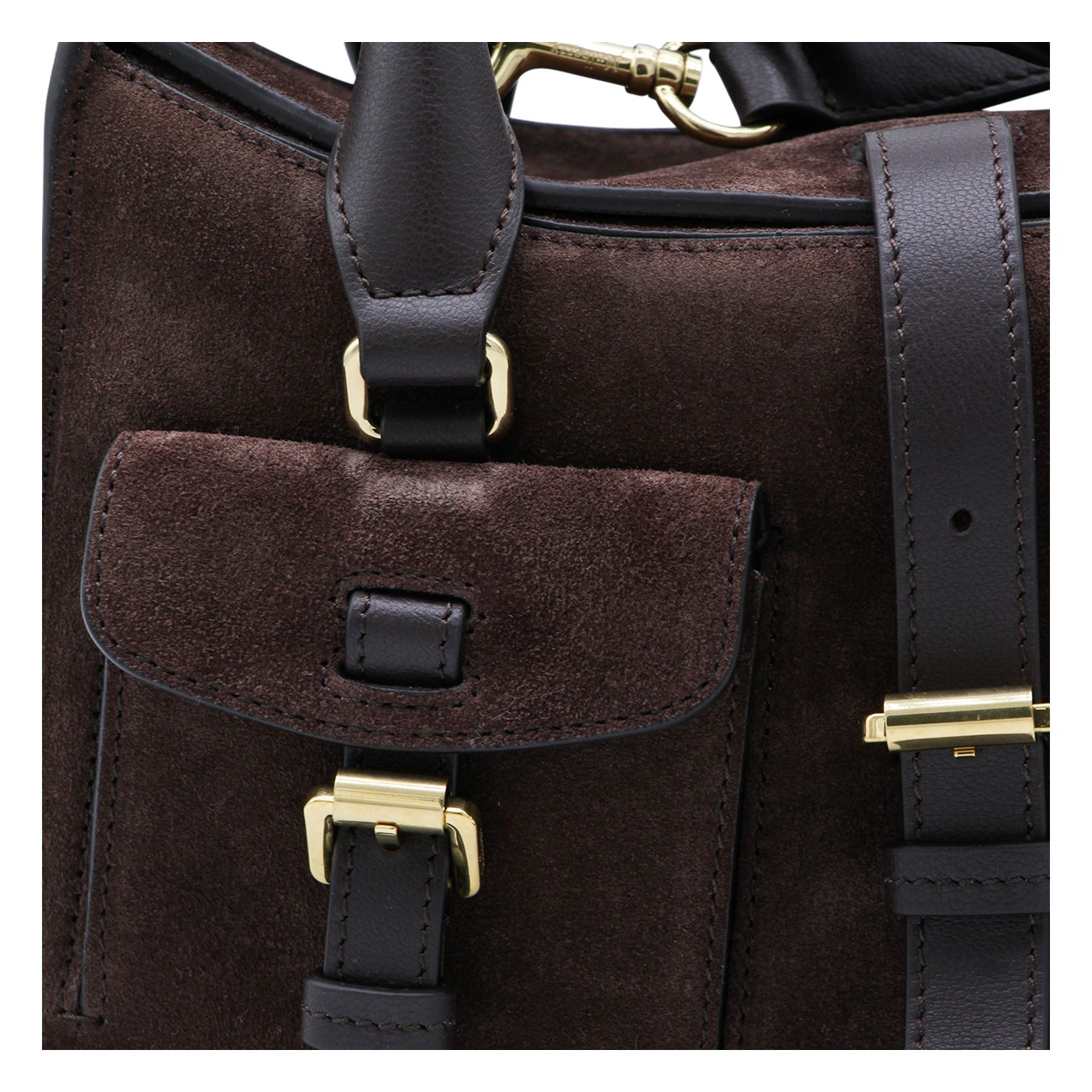 Chocolate leather Small Roxanne Suede top handle bag from Mulberry featuring top handles, removable and adjustable strap, external front pockets with magnetic closure, internal slip pocket, buckle detailingand blind embossed Mulberry signature.