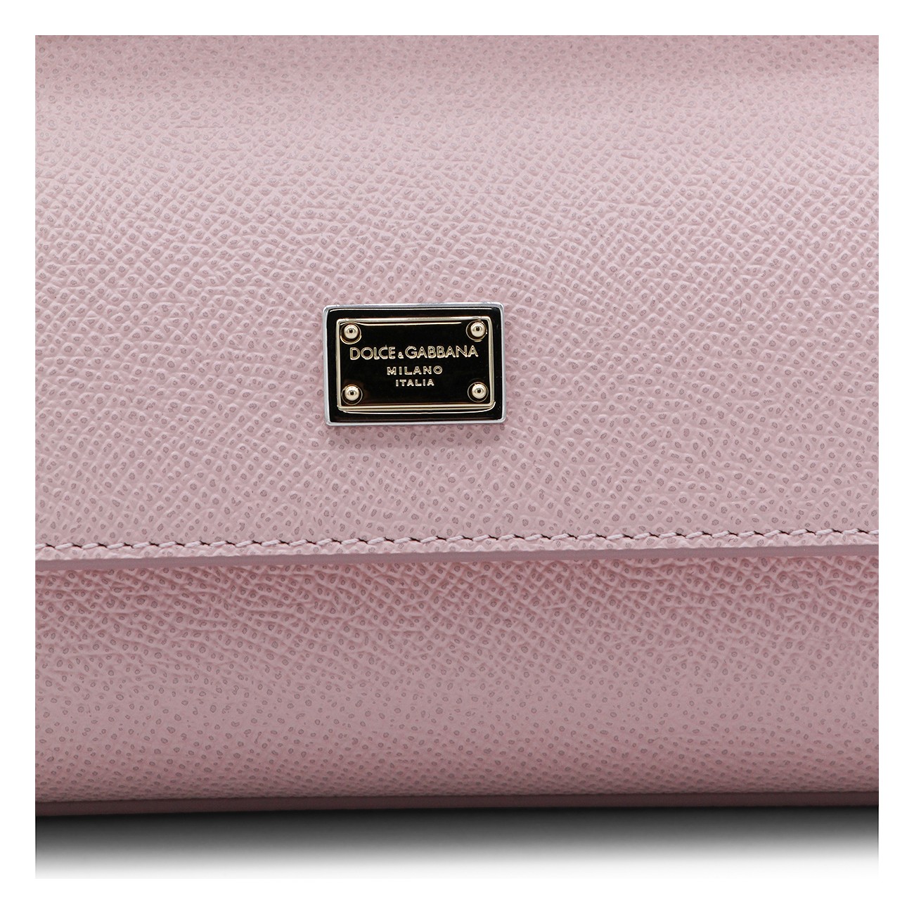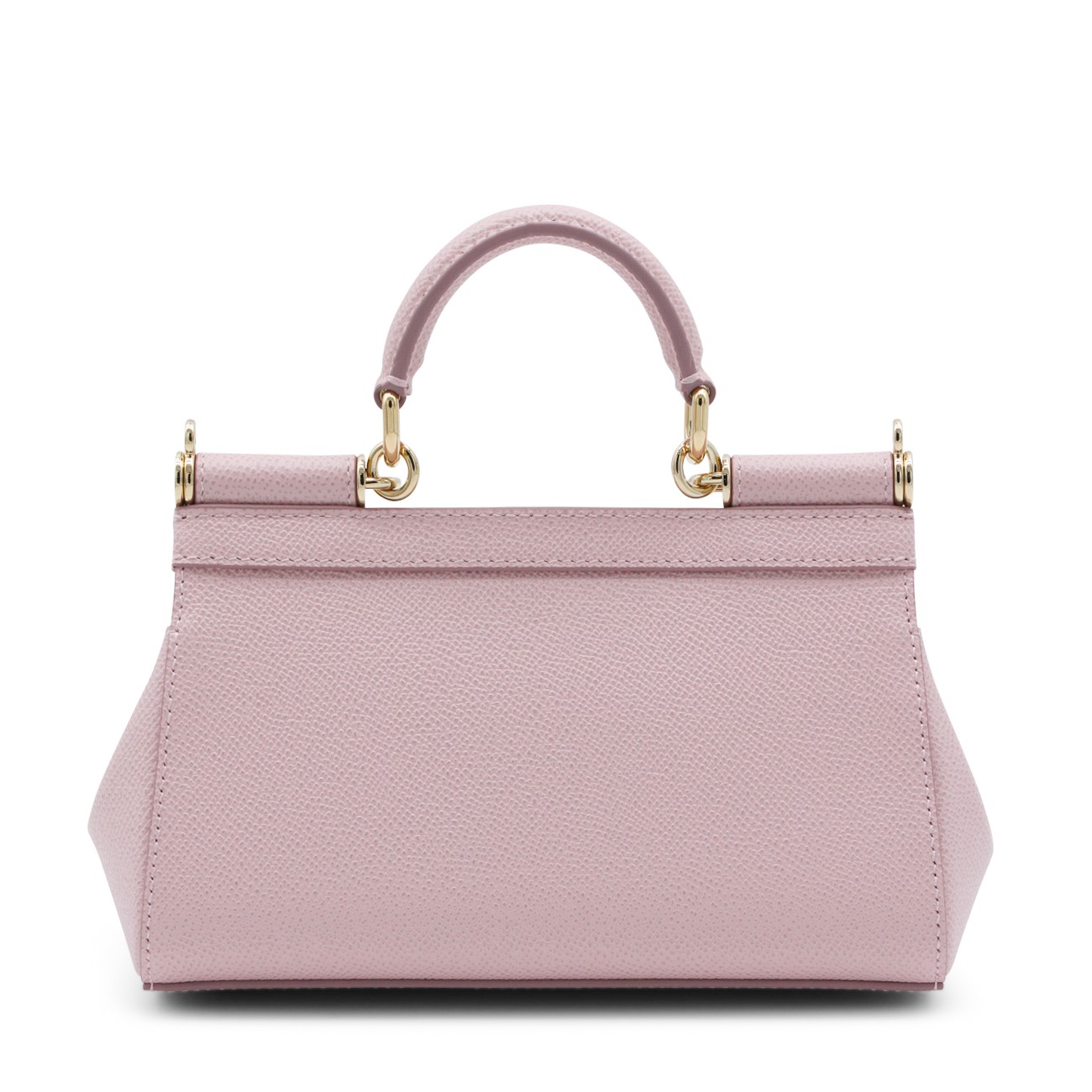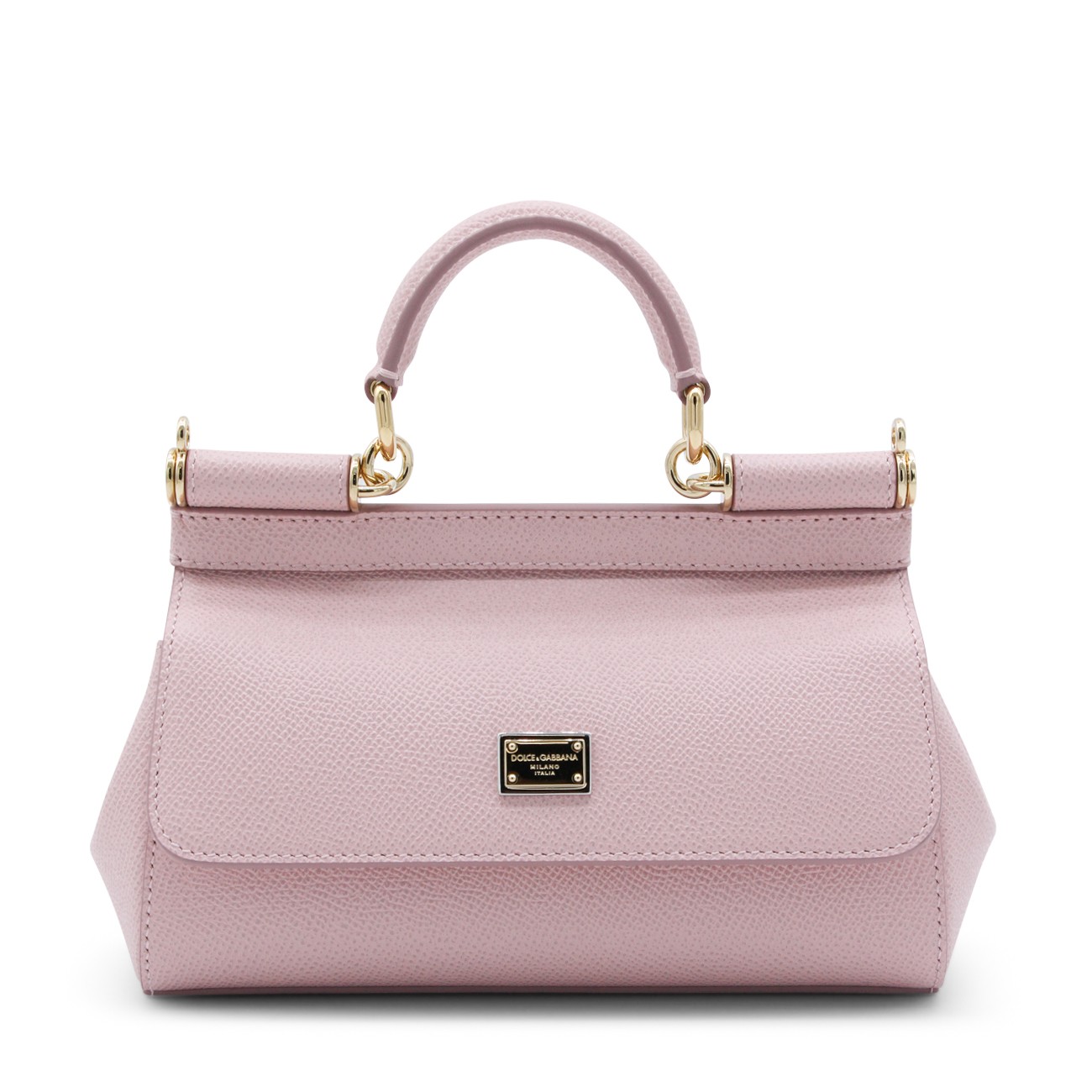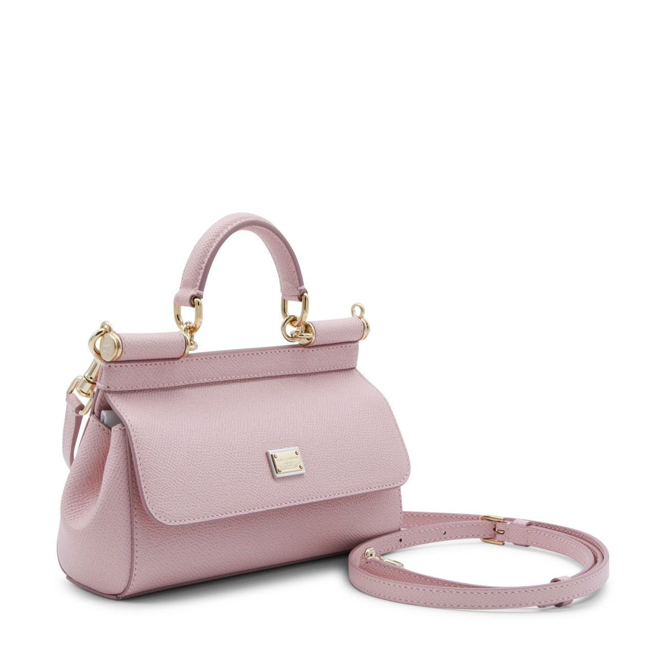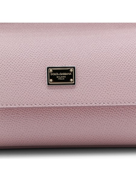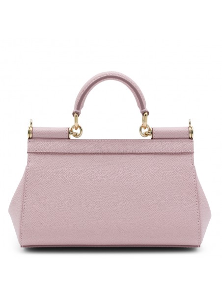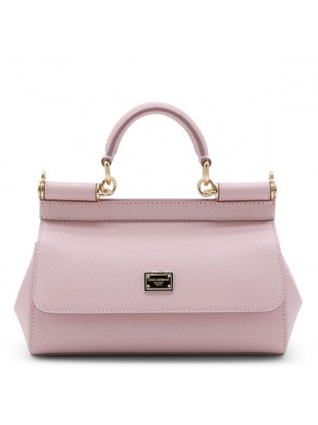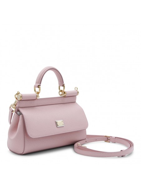 Pink leather Sicily long small top handle bag from Dolce&Gabbana featuring top handle, frontal fastening, adjustable and removable strap, frontal logo patch and inside pocket.