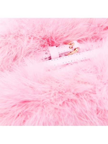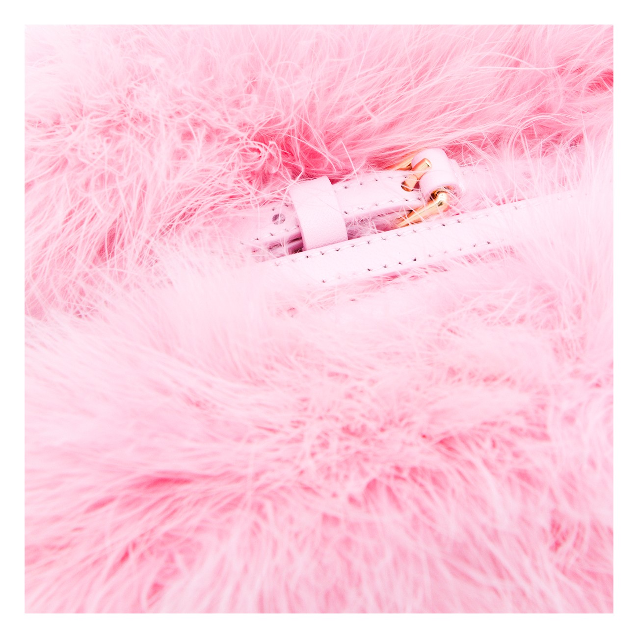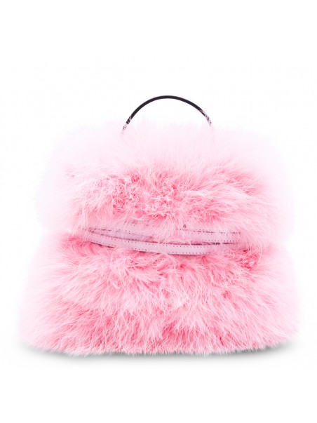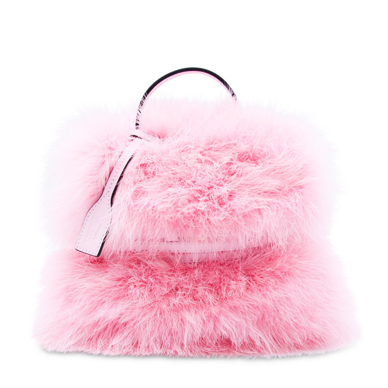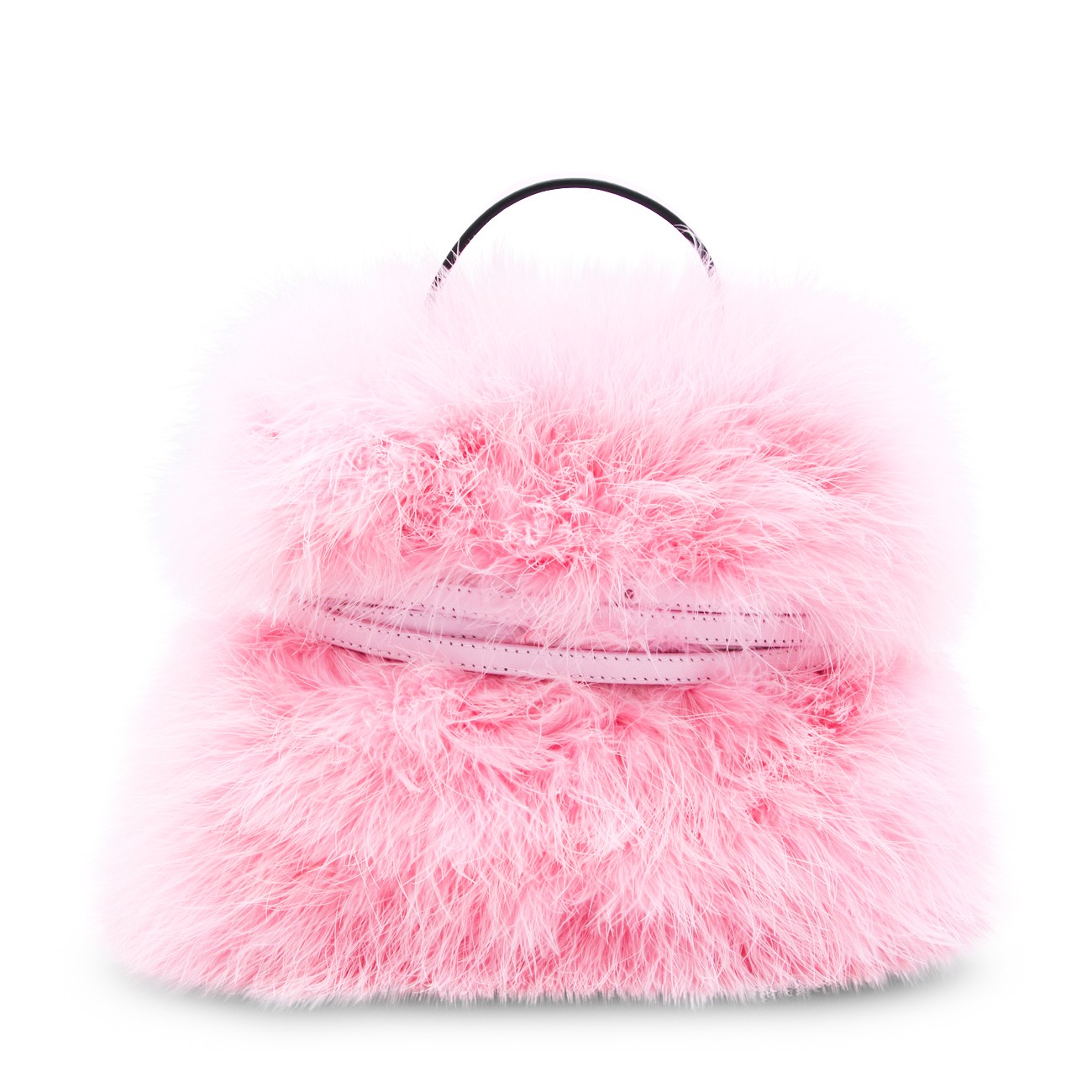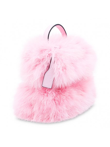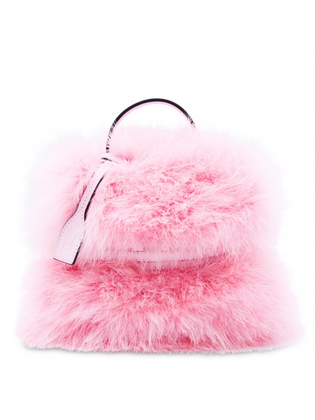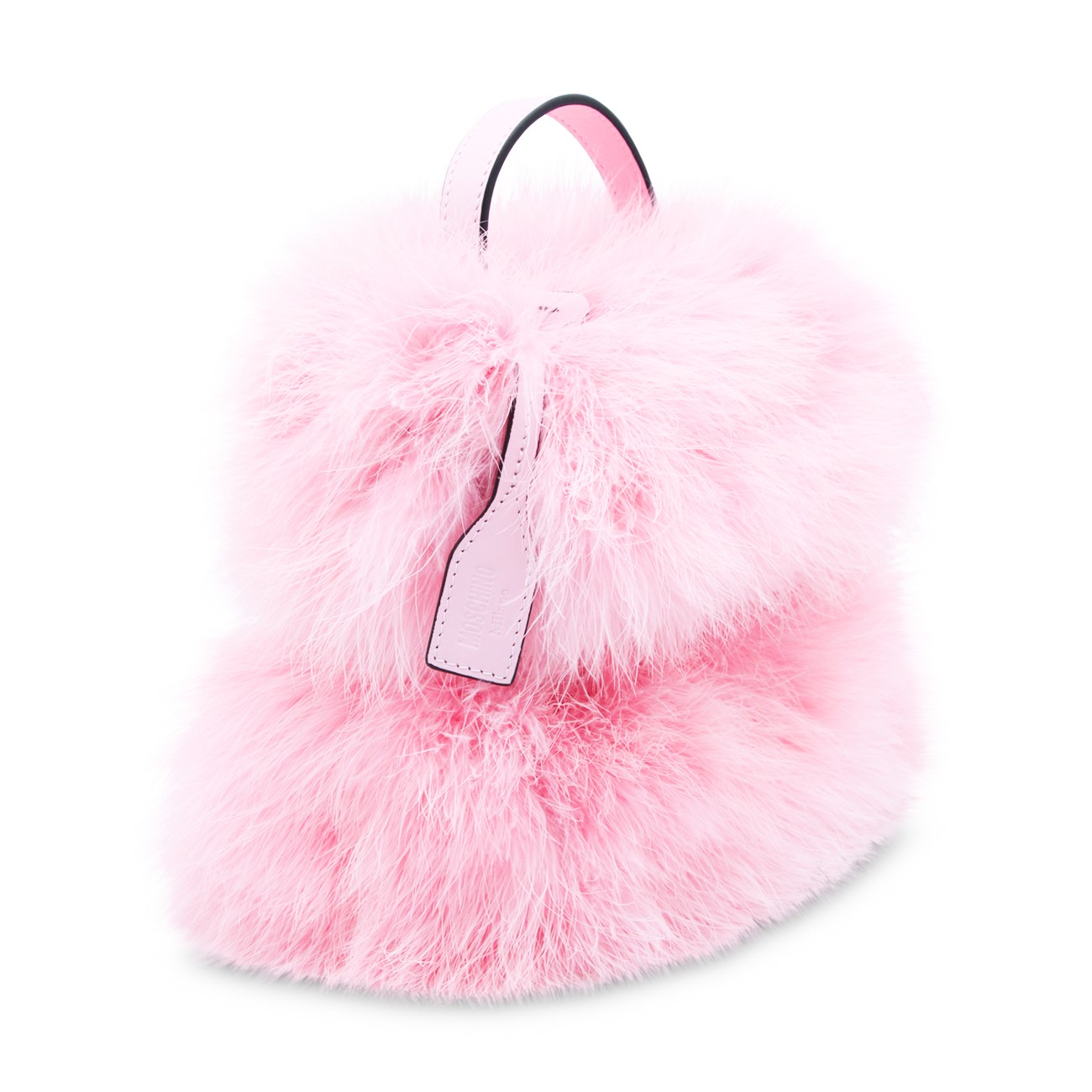 Pink top handle bag from Moschino featuring frontal fastening, top handle, all over hair and inside pocket.