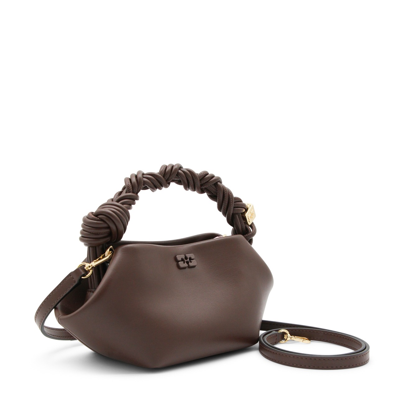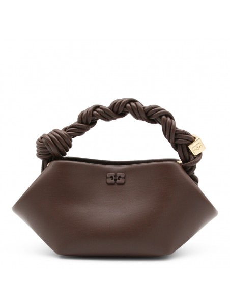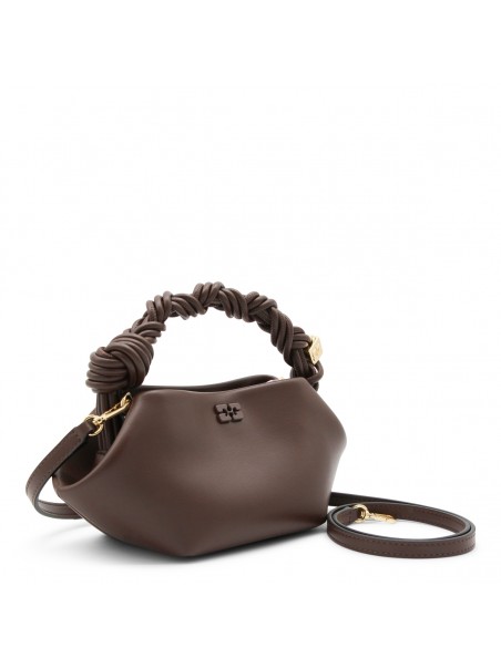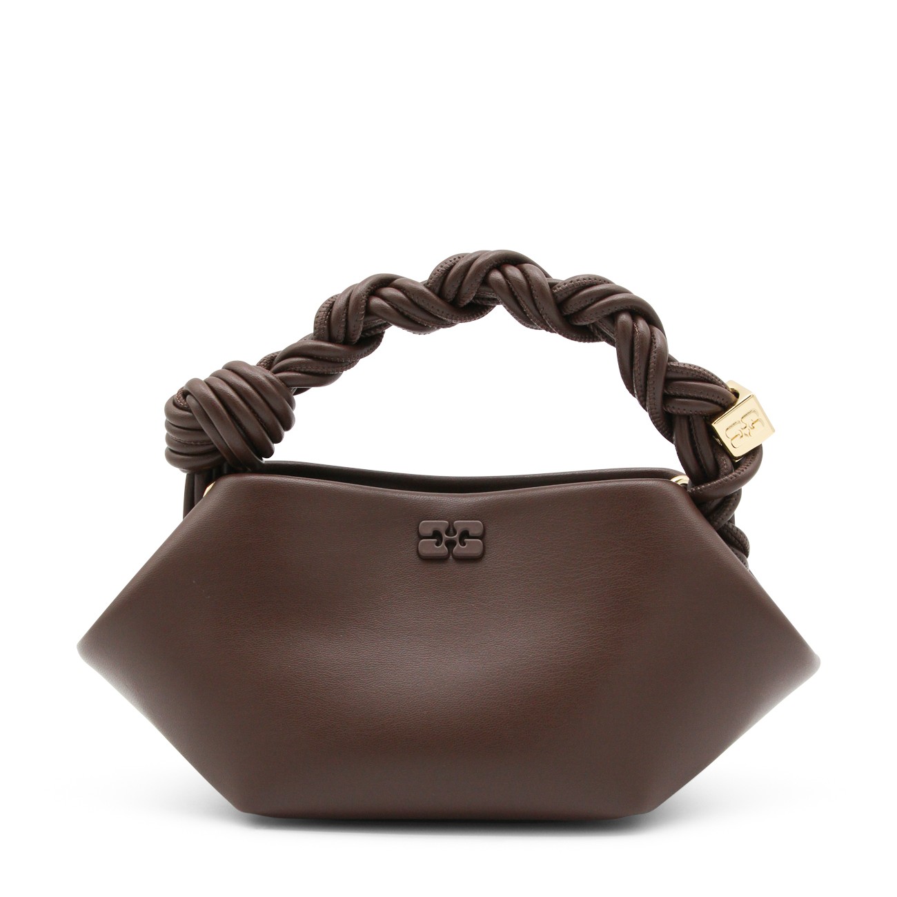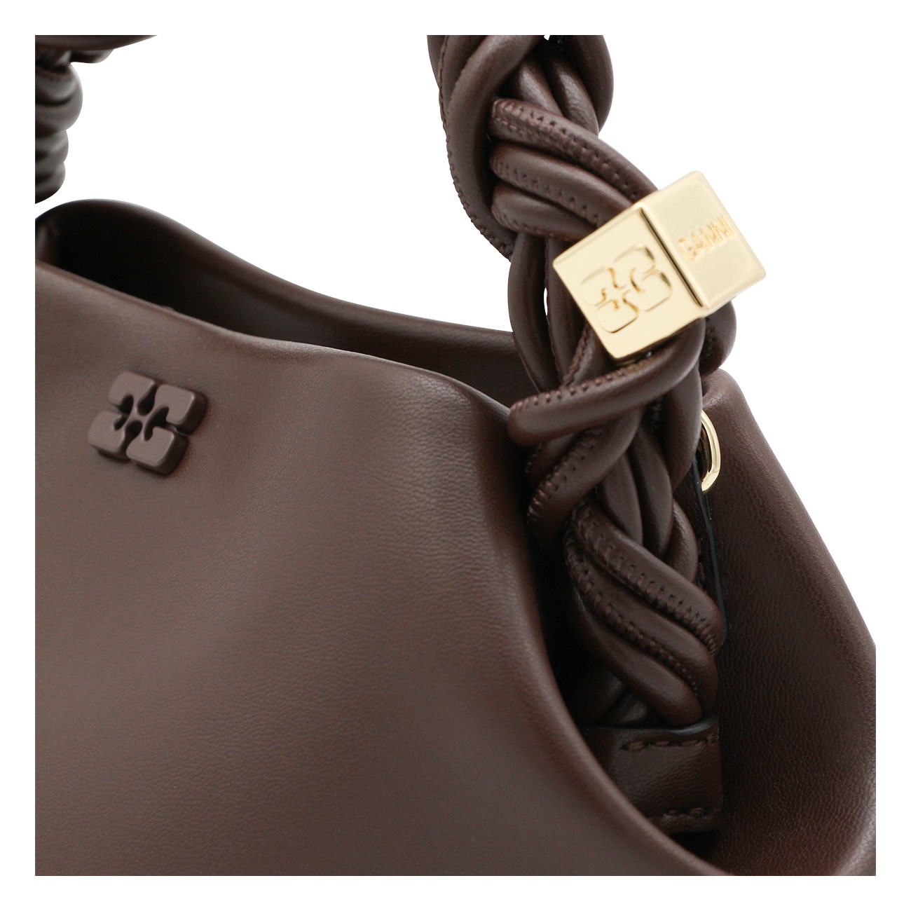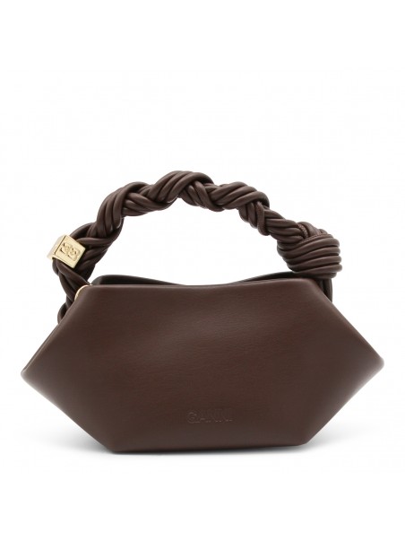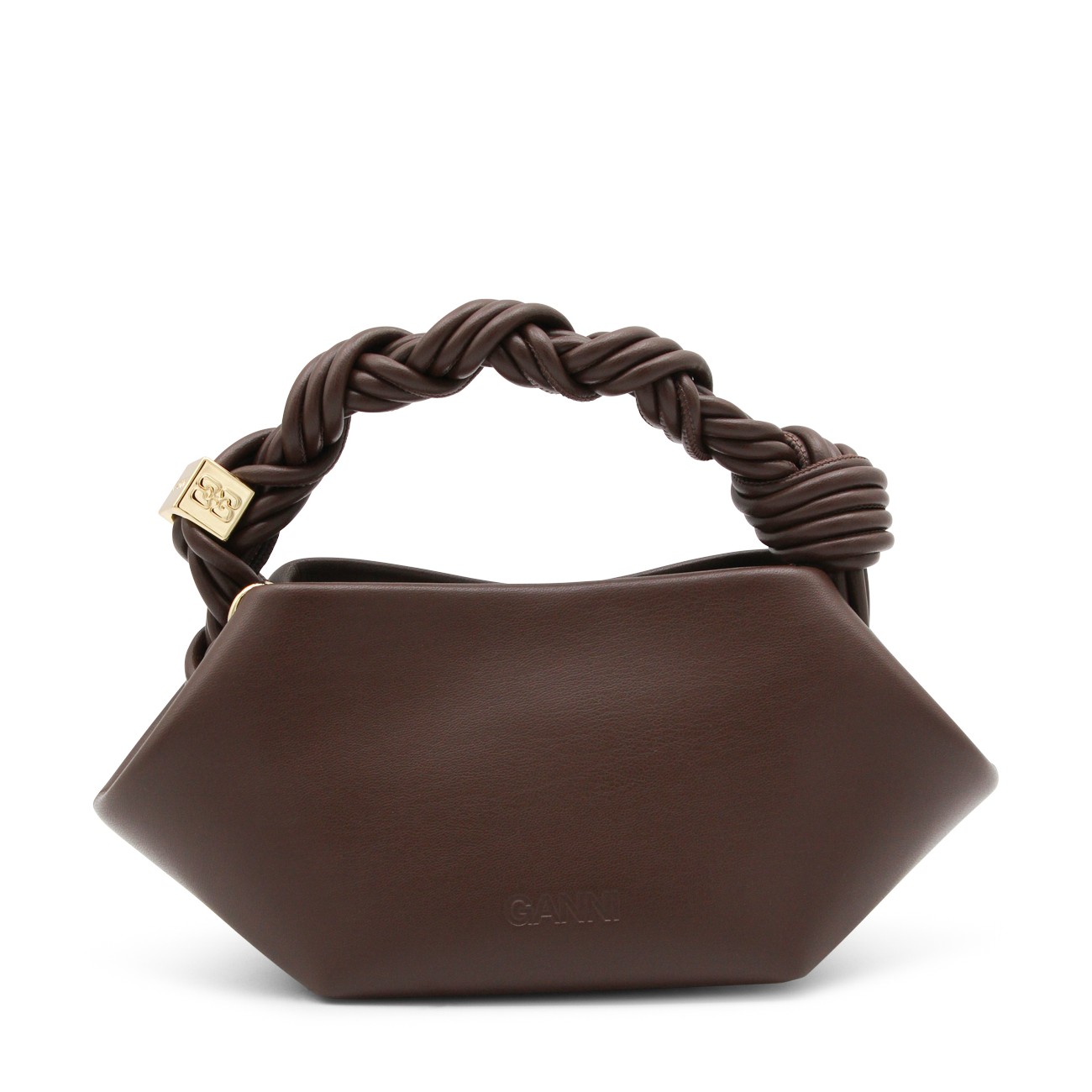 Chocolate top handle bag from Ganni featuring twisted handle, gold tone hardware, engraved logo, magnetic closure, adjustable and removable shoulder strap, main compartment and internal flat card pocket.