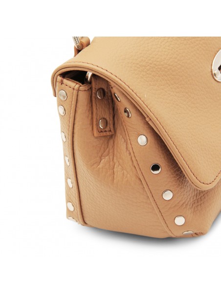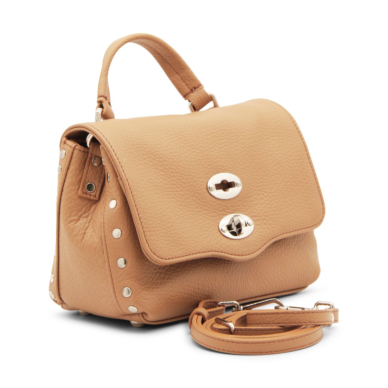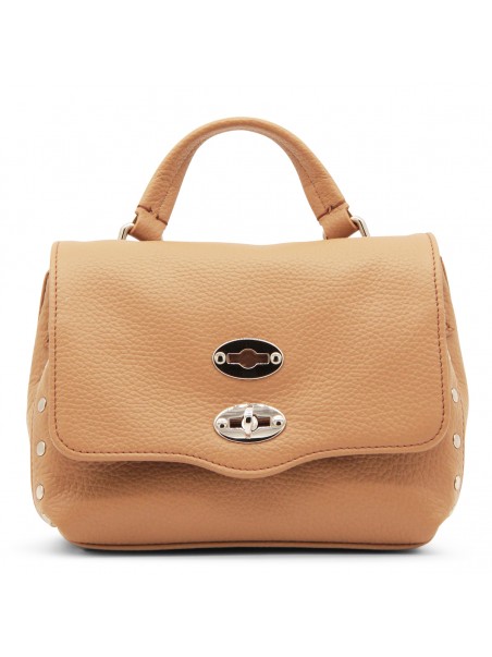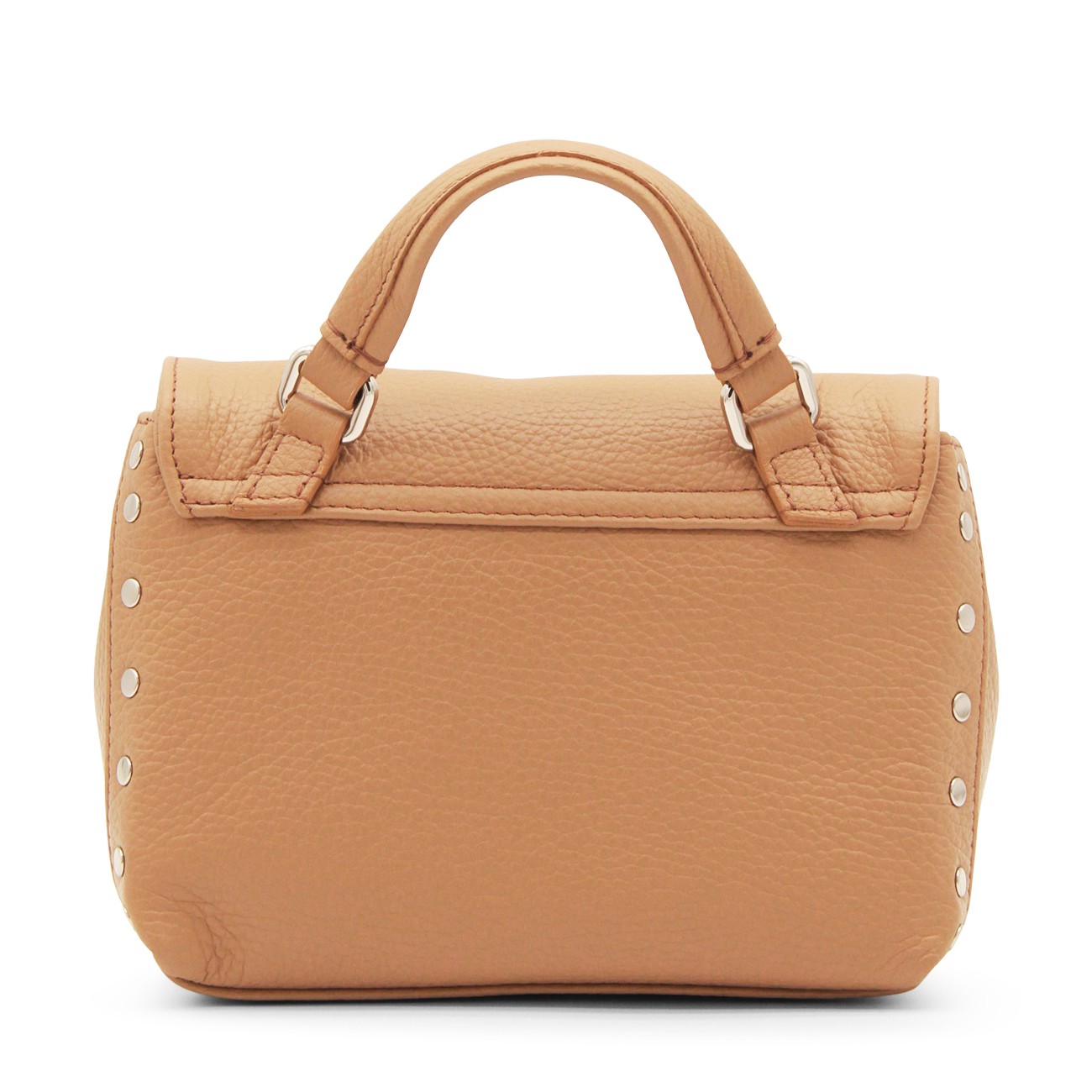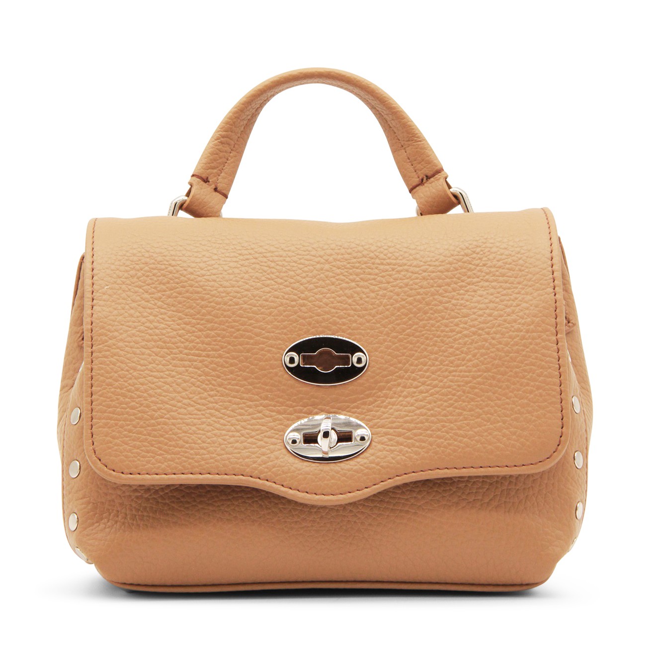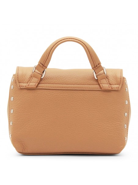 Brown leather Daily Postina Baby tote bag from Zanellato featuring pebbled texture, silver-tone stud detailing, silver-tone hardware, internal logo patch, single flat top handle, detachable shoulder strap, foldover top, main compartment and internal slip pocket.