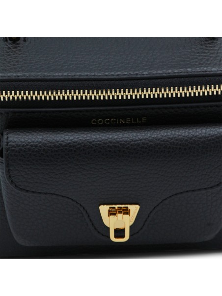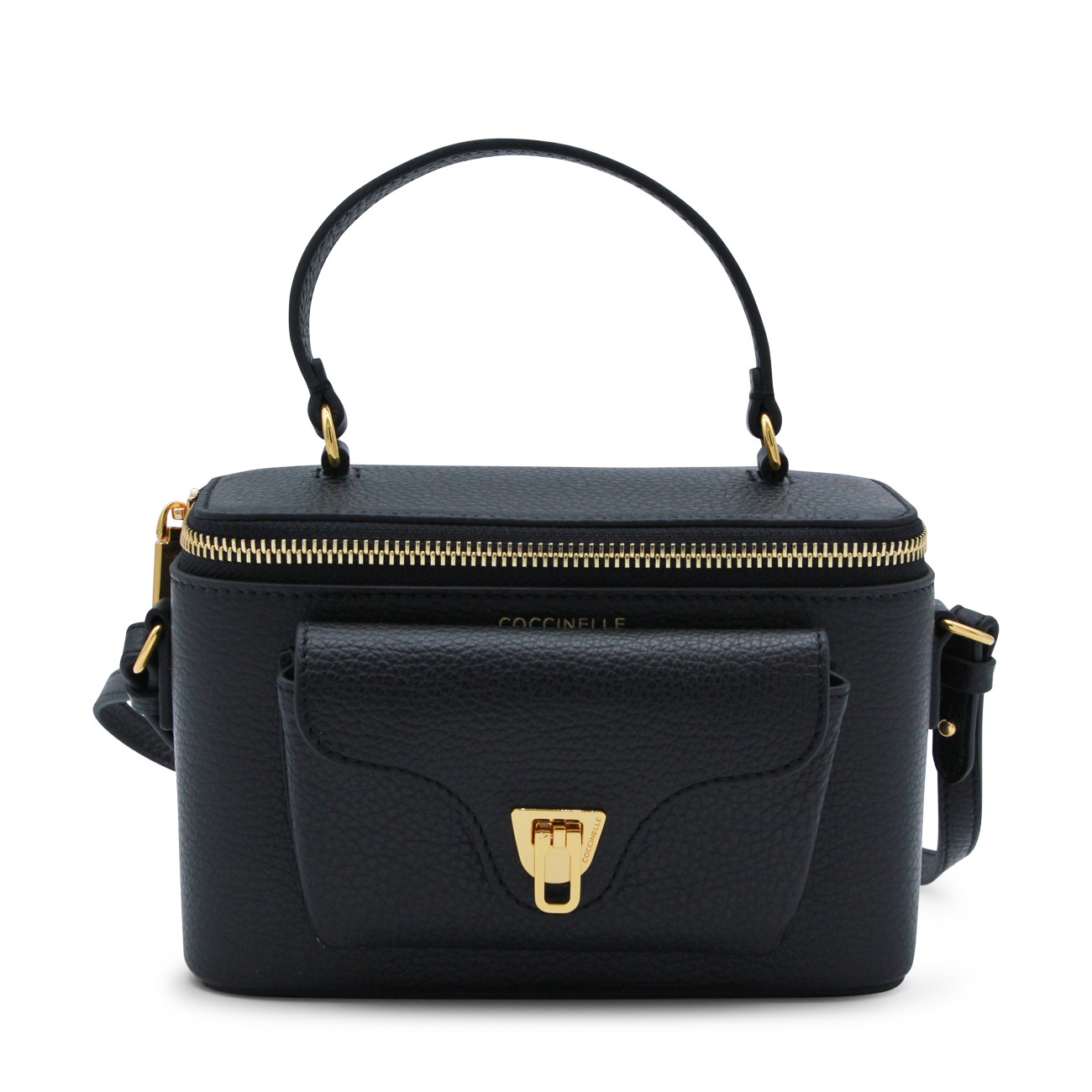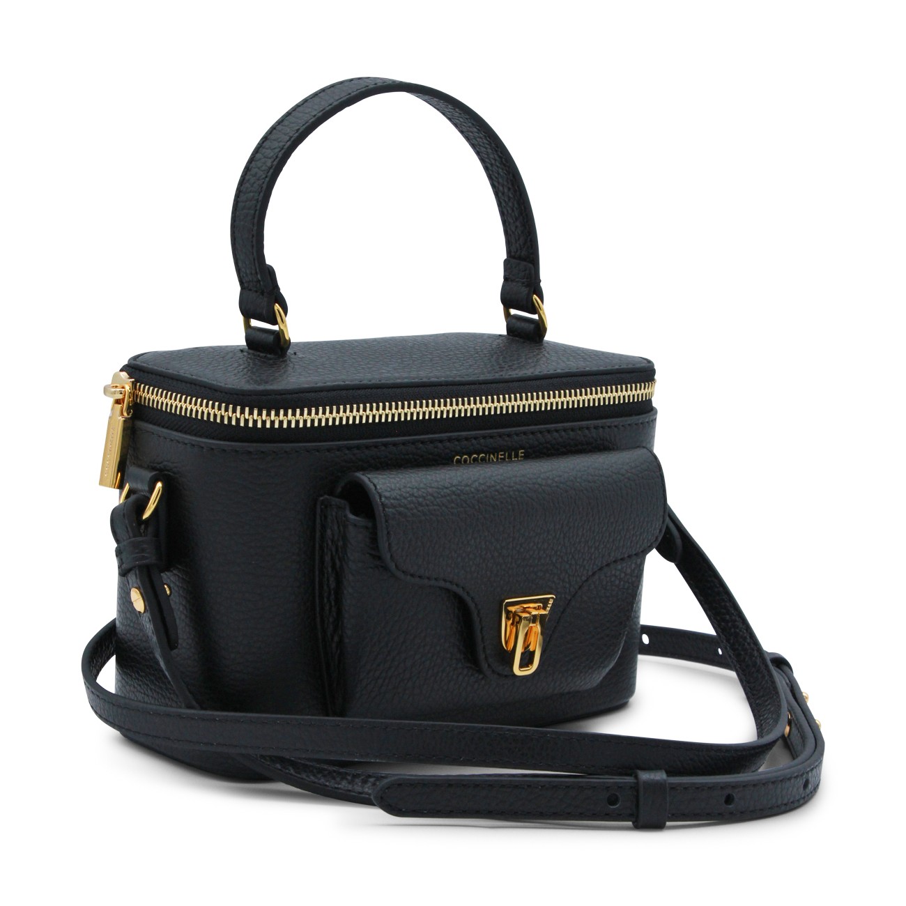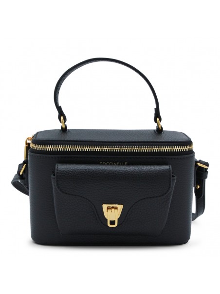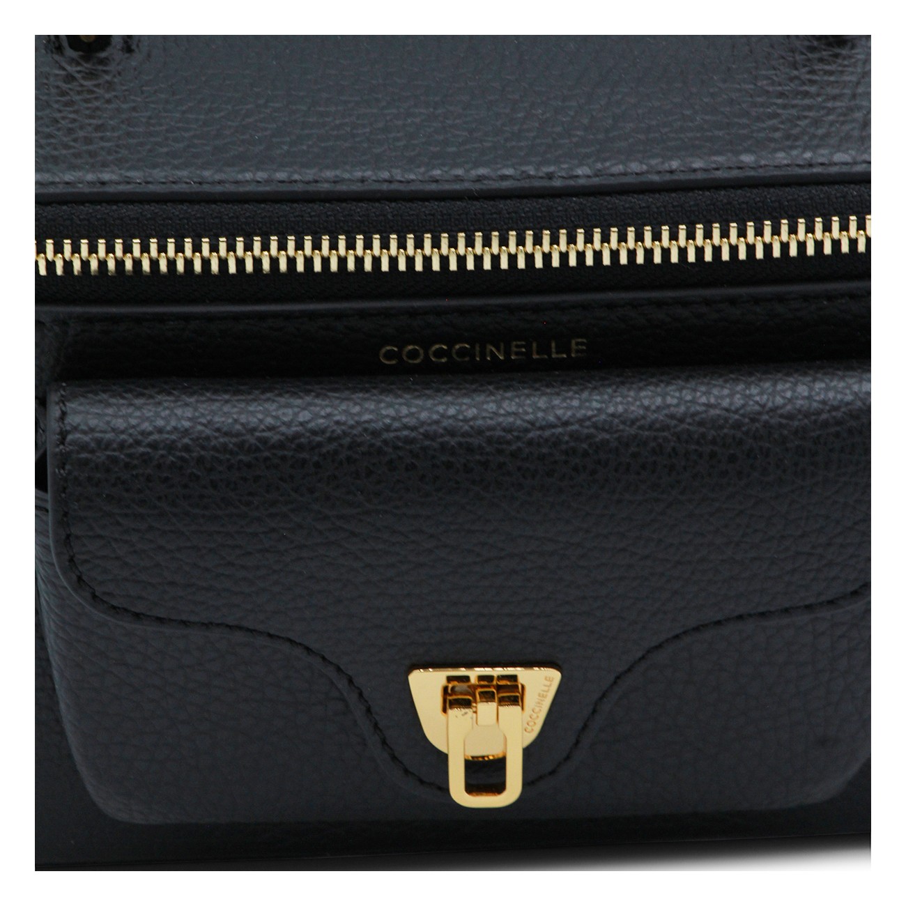 Black leather Beat Generation top handle bag from Coccinelle featuring top handle, gold tone hardware, removable and adjustable shoulder strap, frontal pocket with button closure, main compartment and logo.