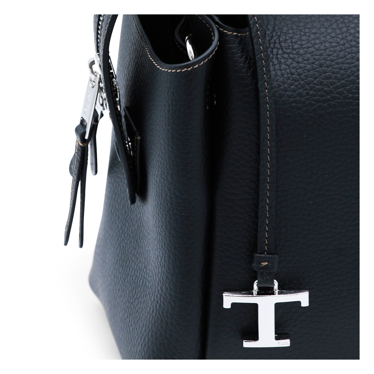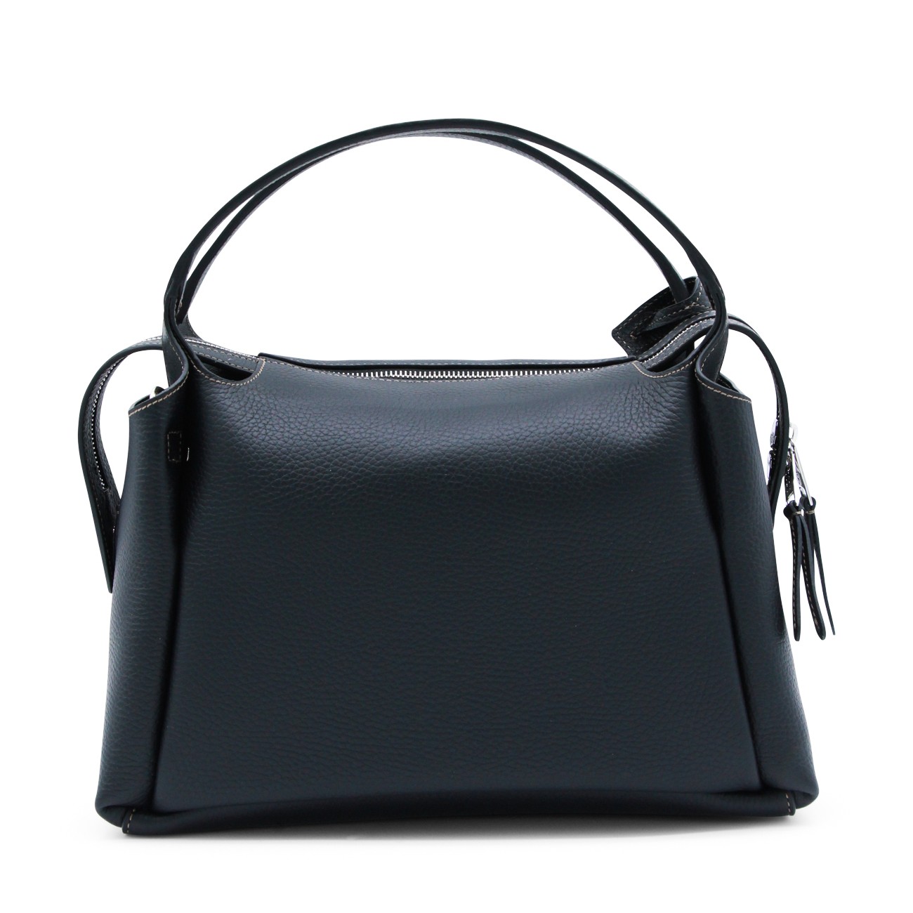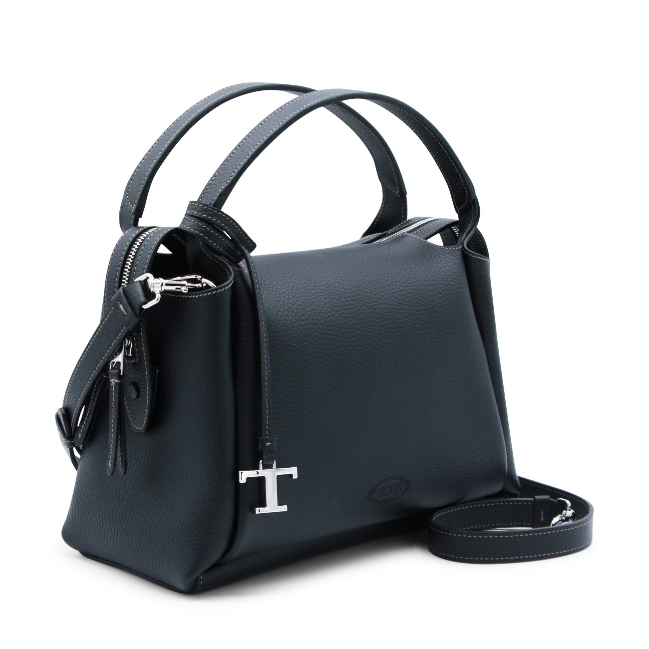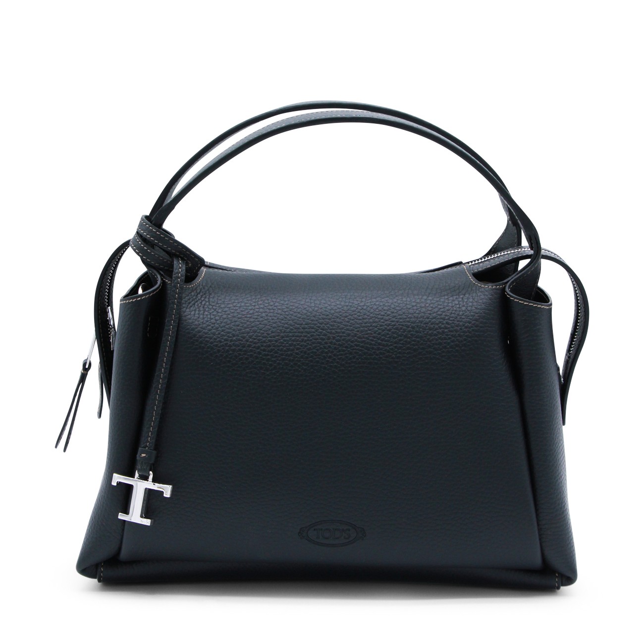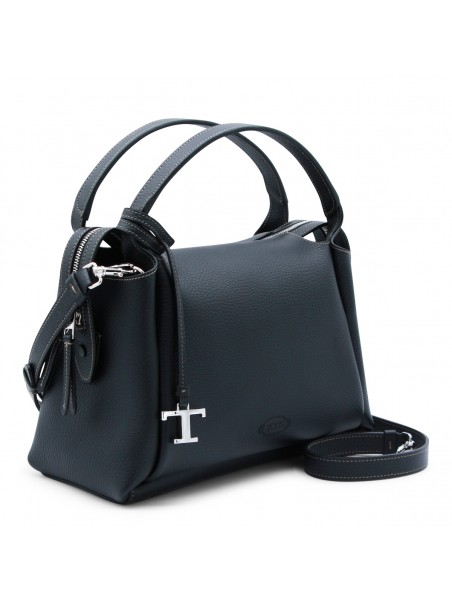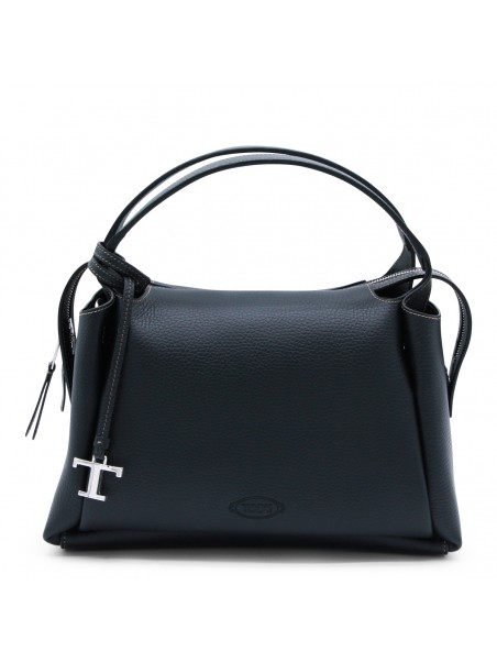 Black leather top handle bag from Tod's featuring top handles, silver tone logo hardware, zip fastening, main compartment, removable and adjustable shoulder strap, logo and details.