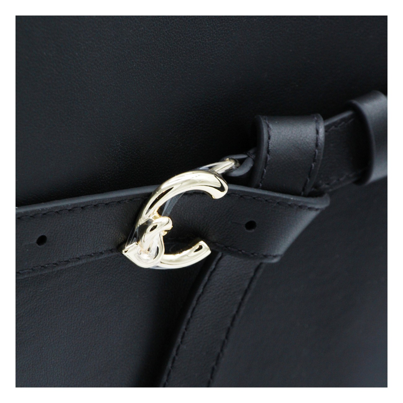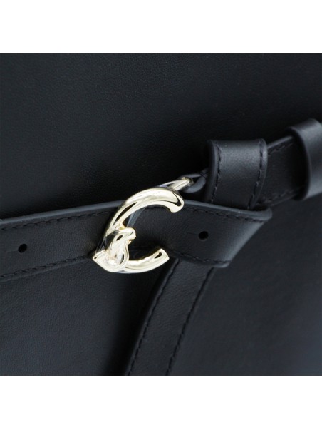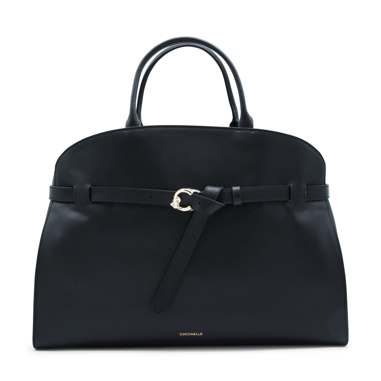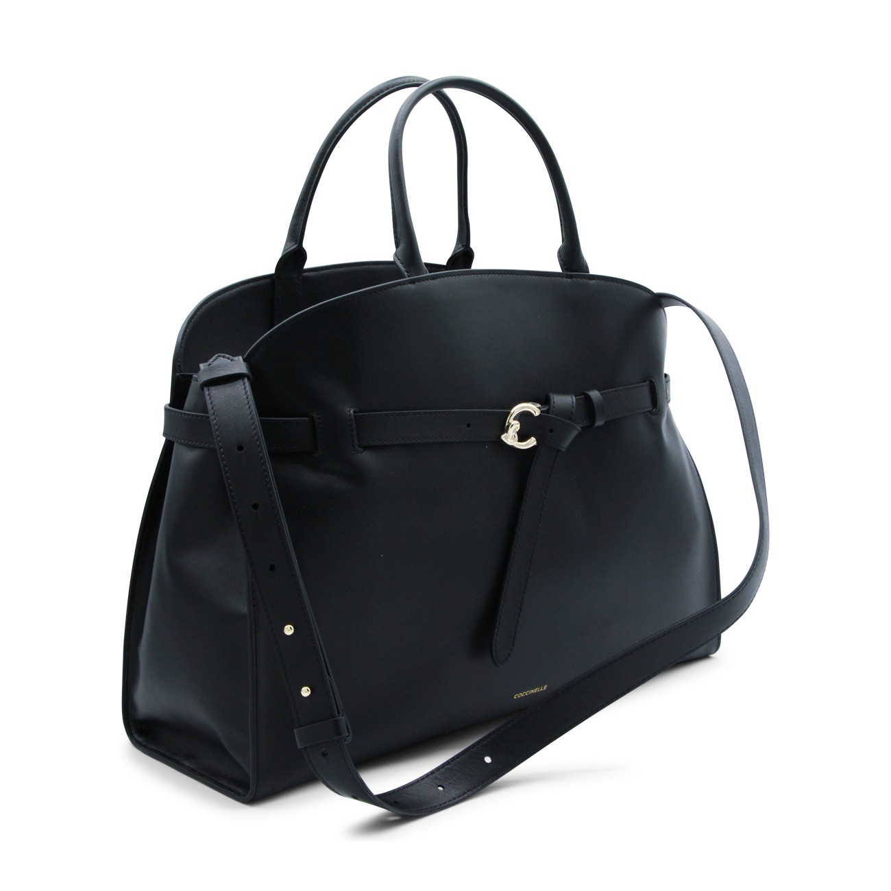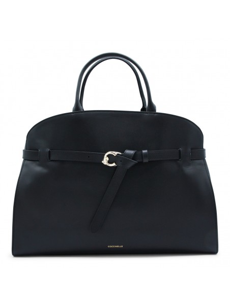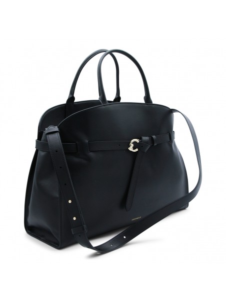 Black leather Sabine top handle bag from Coccinelle featuring buckle fastening, top handles, removable shoulder strap, gold tone hardware, internal zip pockets and logo.