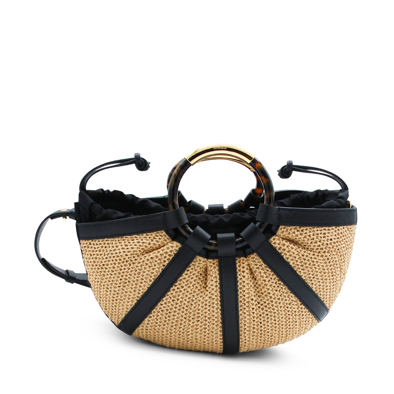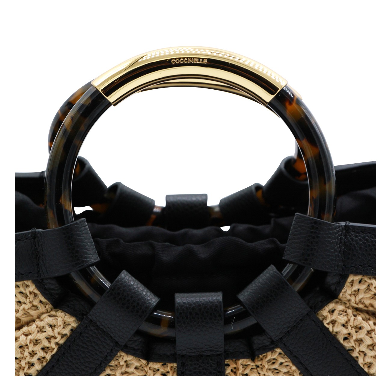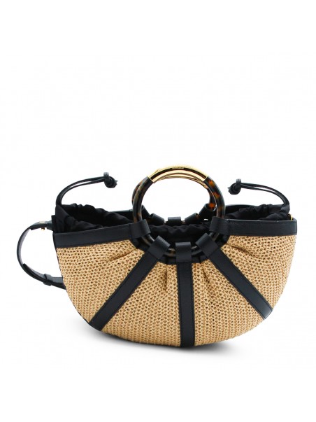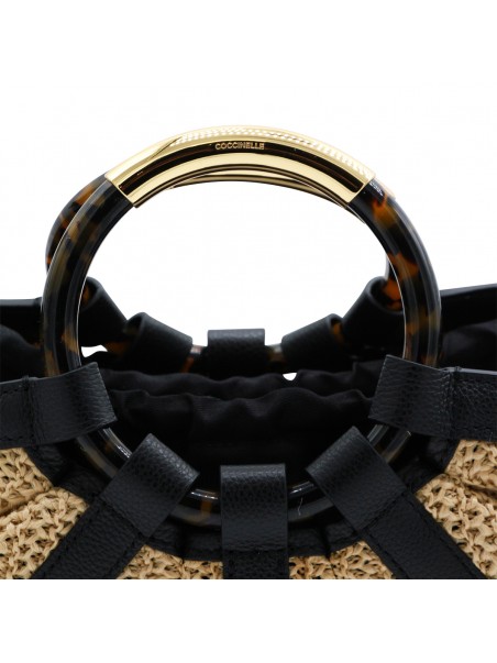Natural and black leather top handle bag from Coccinelle featuring top handles, removable and adjustable shoulder strap, main compartment with laces fastening, internal pocket, gold tone hardware and logo details.