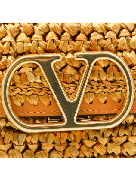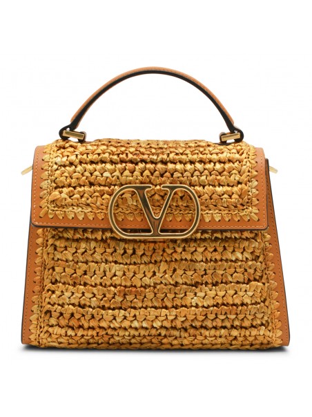 Beige and gold leather top handle bag from Valentino Garavani featuring top handle, adjustable and removable shoulder strap, knitted texture, magnetic closure with logo, inside zip pocket.