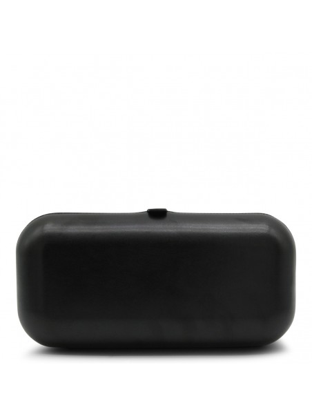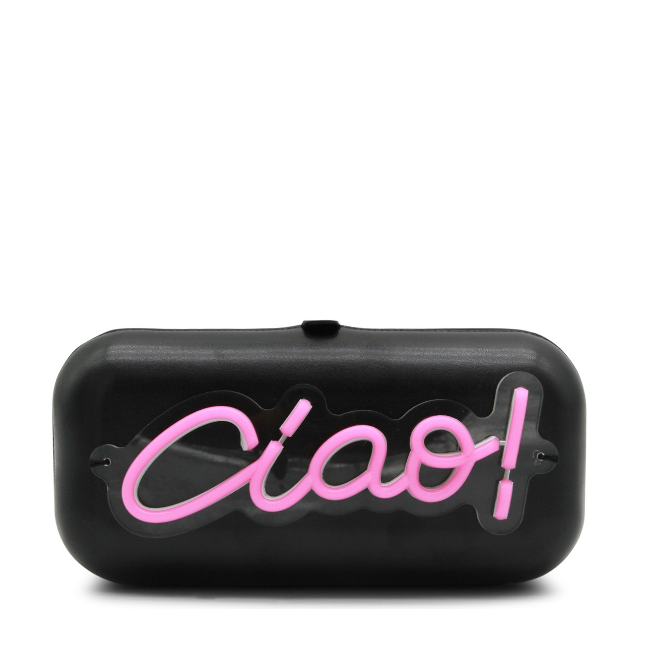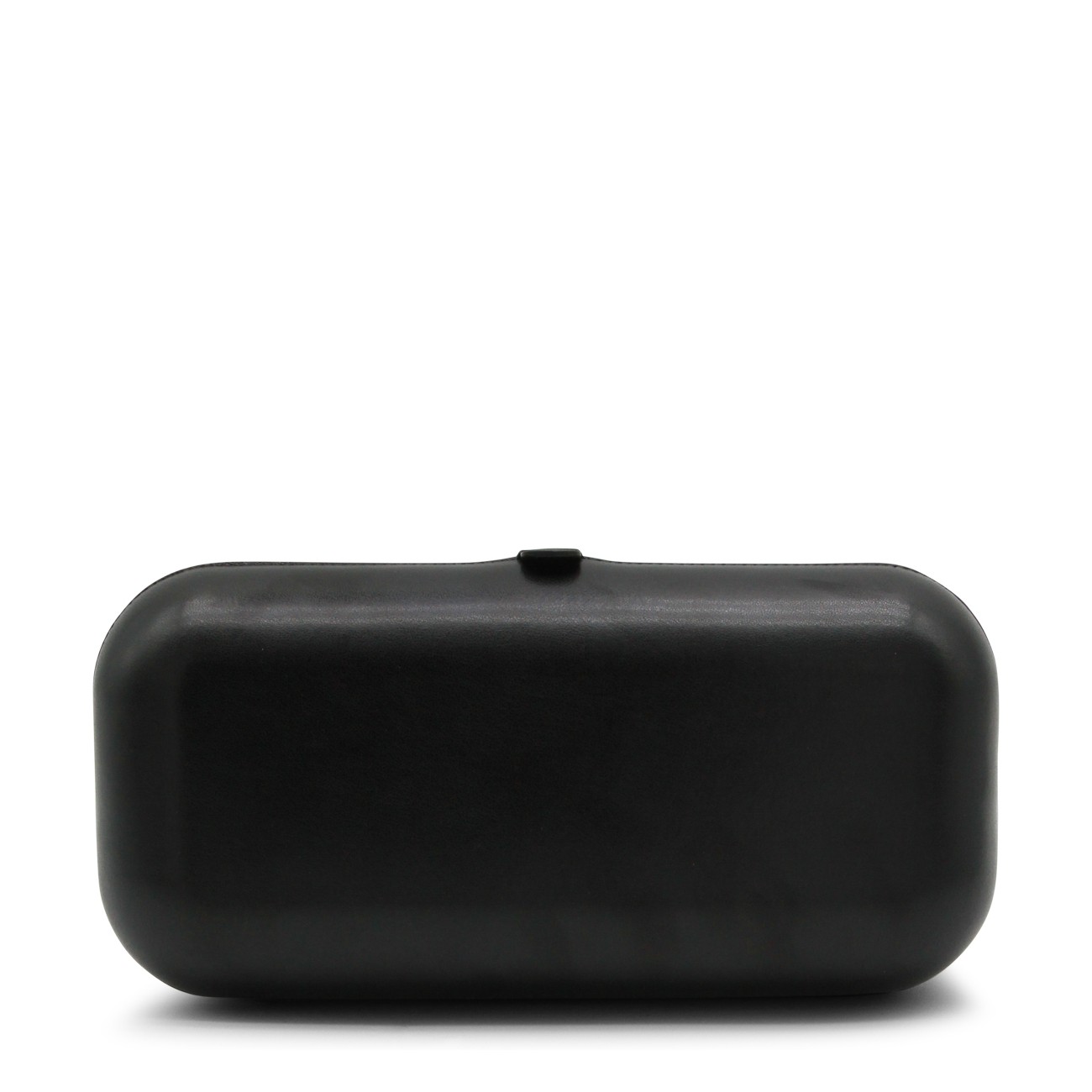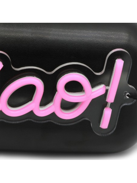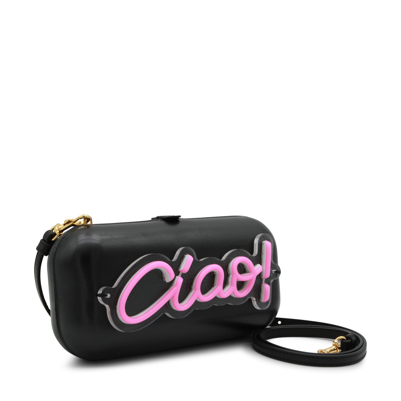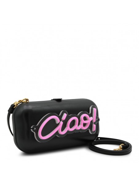 Black leather bag frpm Moschino featuring upper fastening, frontal detail, adjustable and removable strap and gold tone hardware.