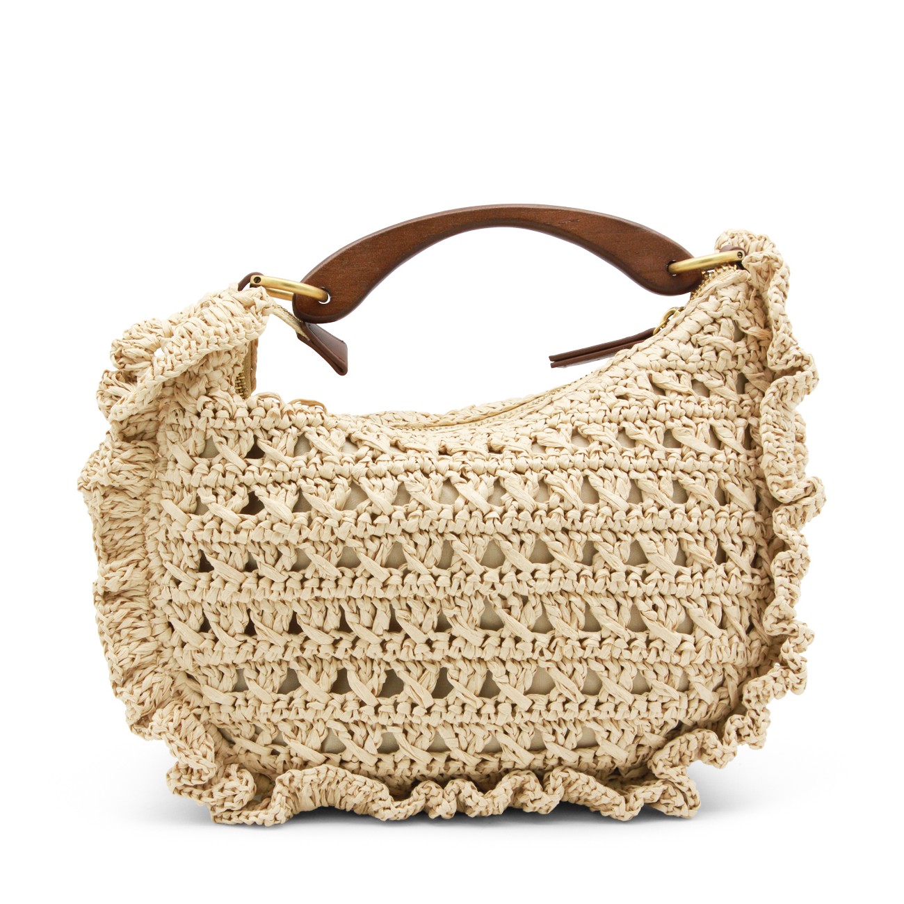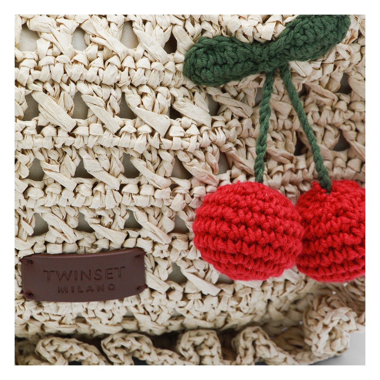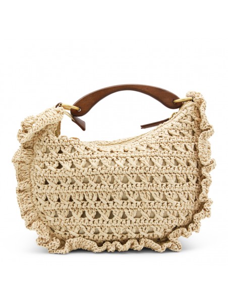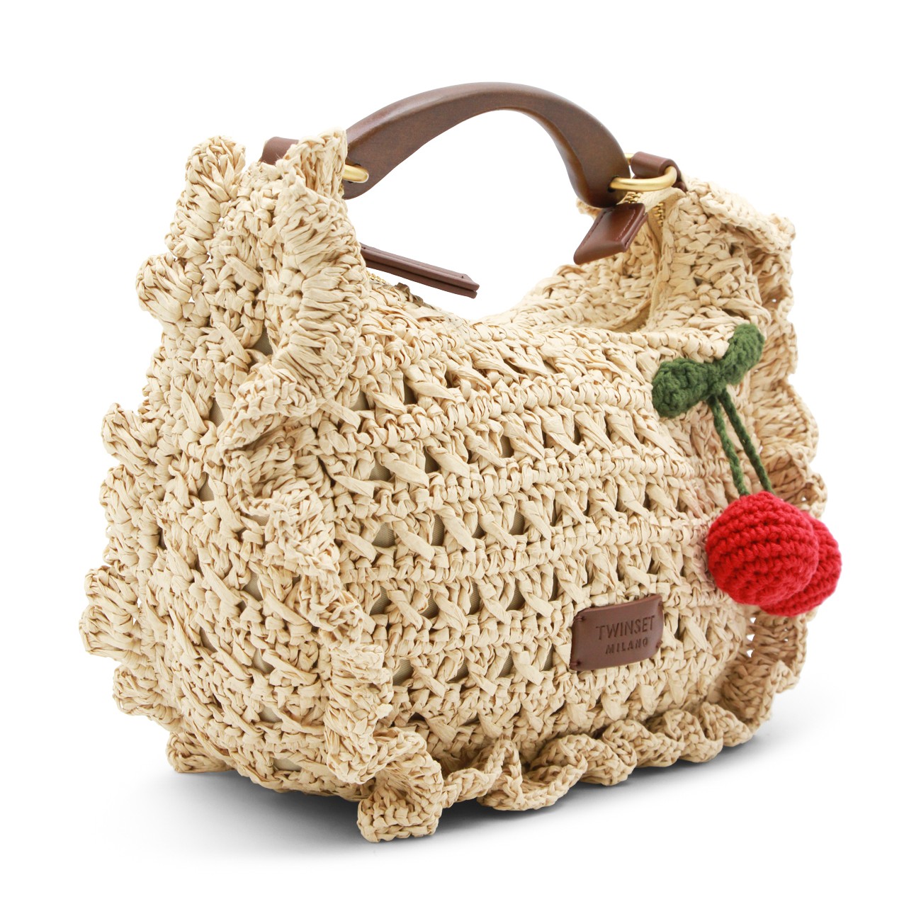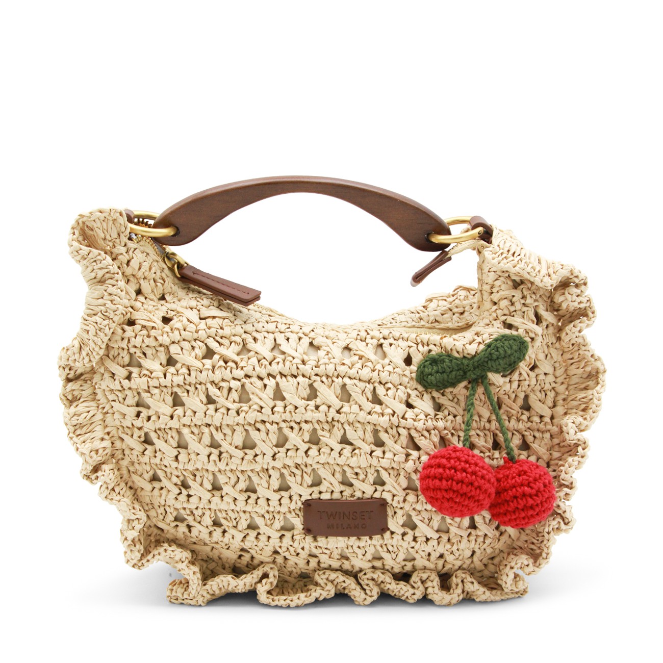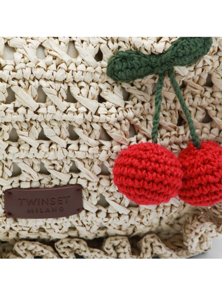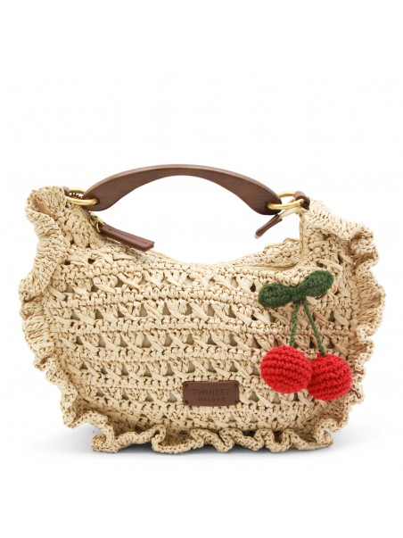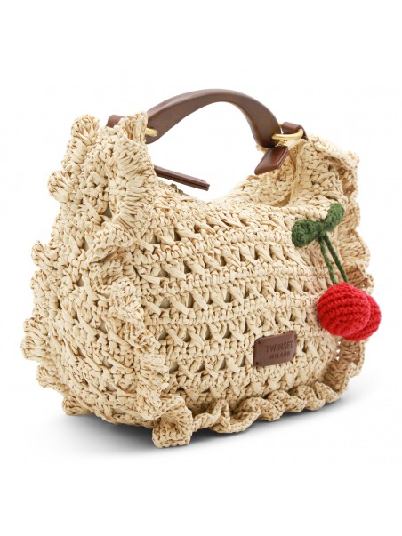 Raffia top handle bag from Twinset featuring single handle, zip closure, logo label, gold tone metal hardware and adjustable and detachable shoulder strap.