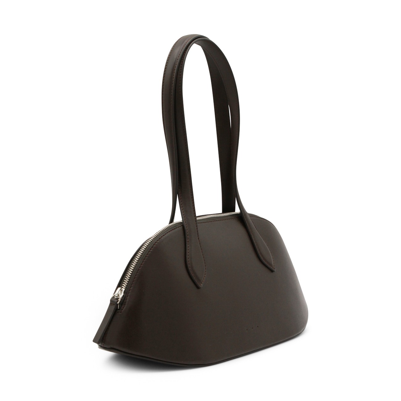 Dark brown leather Cosmo Bowling top handle bag from Aesther Ekme featuring top handles, upper zip fastening, embossed logo and inside pocket.