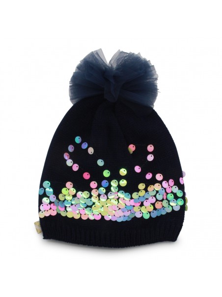 Marine paillettes beanie from Billieblush featuring multicolor paillettes details, ribbed hems, tulle bow detail and logo label.