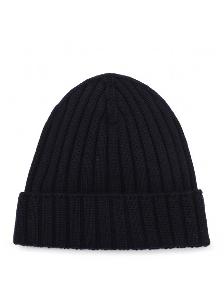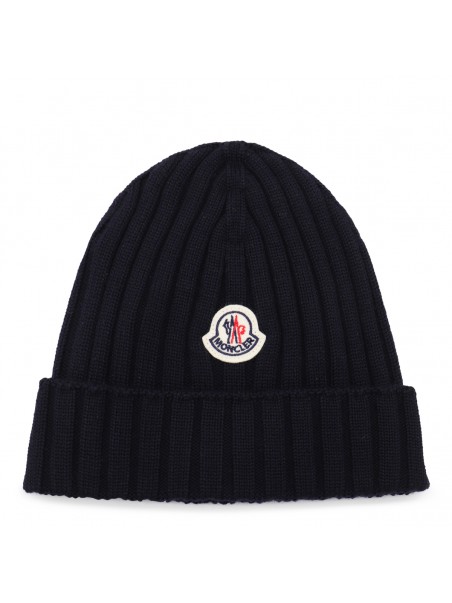 Blue wool hat from Moncler featuring ribbed trim, logo patch and regular vestibility.