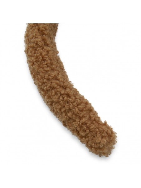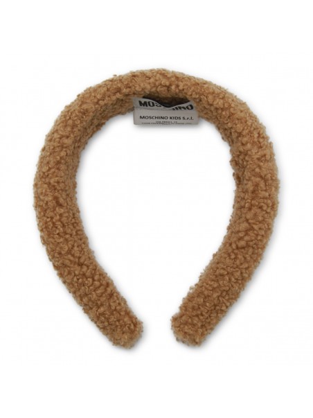 Brown hair accessories from Moschino featuring logo patch and hairs.
