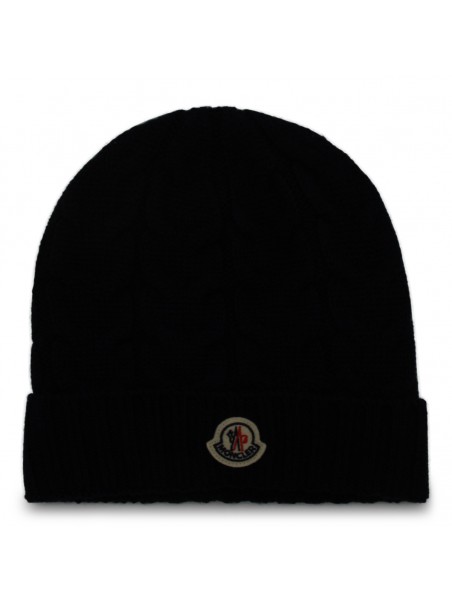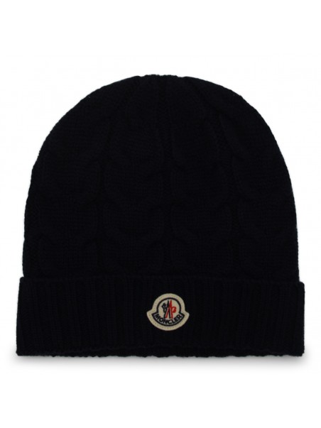 Dark blue wool hat from Moncler featuring ribbed trim and logo patch.