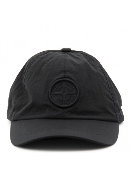Black nylon hat from Stone Island featuring round trim, logo patch and adjustable size.