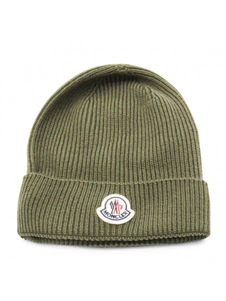 Olive wool hat from Moncler featuring ribbed trim, logo patch and regular vestibility.