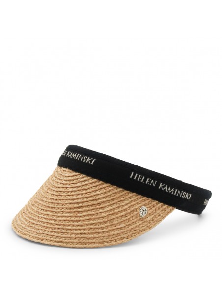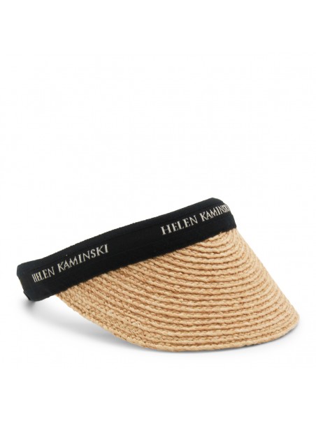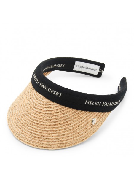 Beige raffia hat from Helen Kaminski featuring open back, round trim and logo detail.