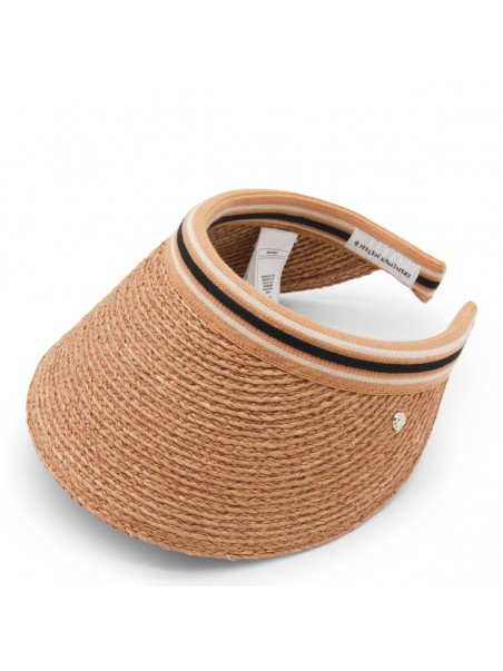 Dark beige raffia hat from Helen Kamiski featuring round trim, adjsutable size and logo details.