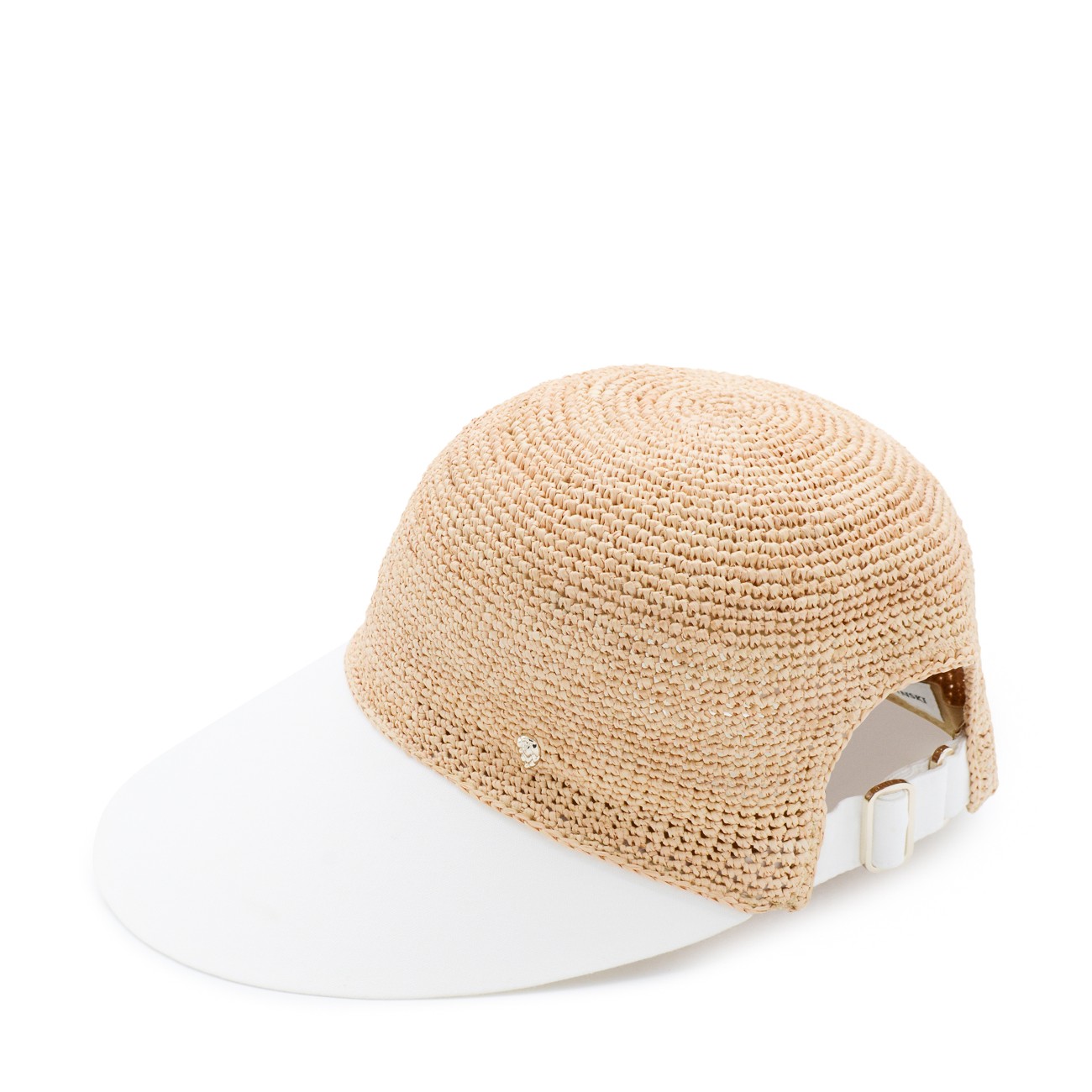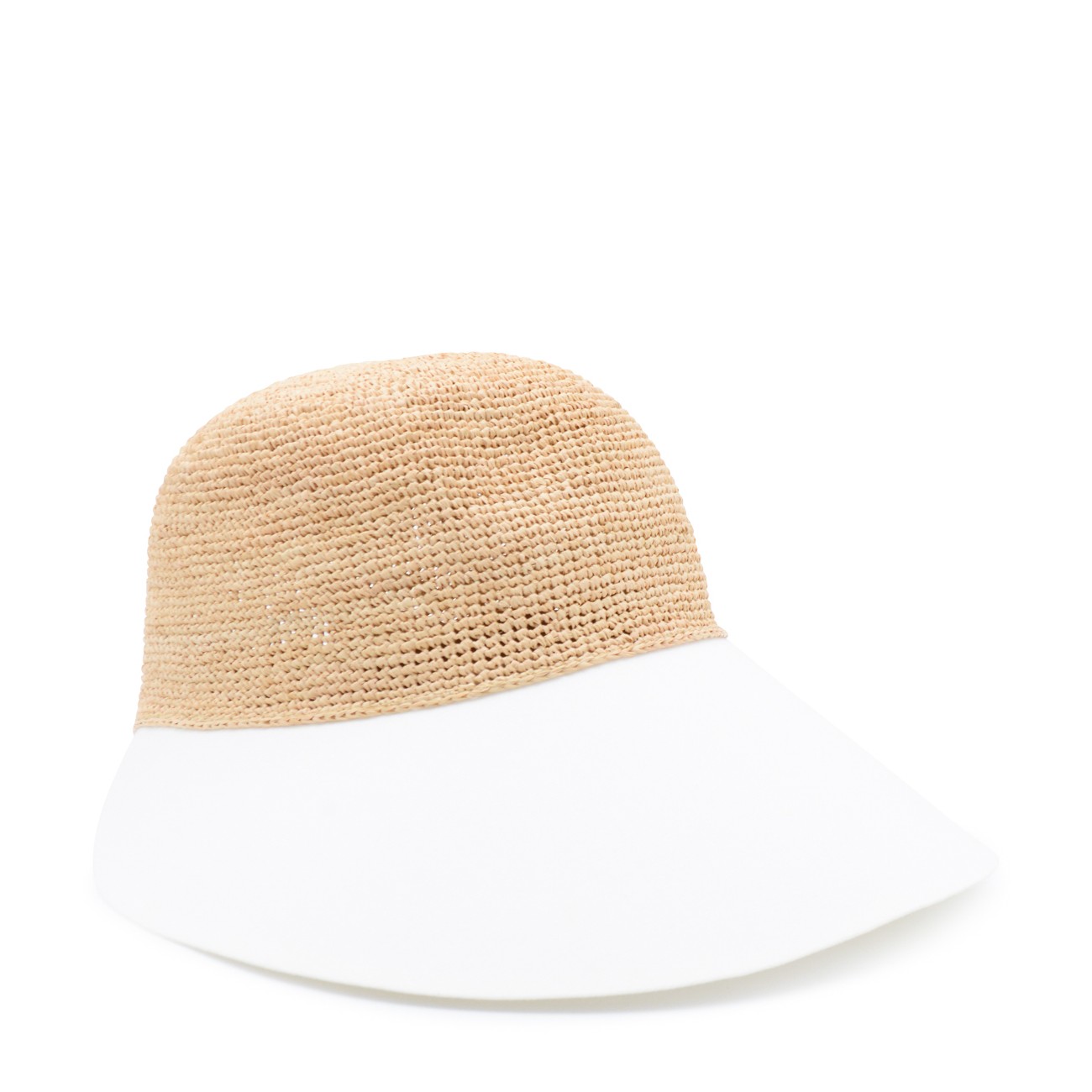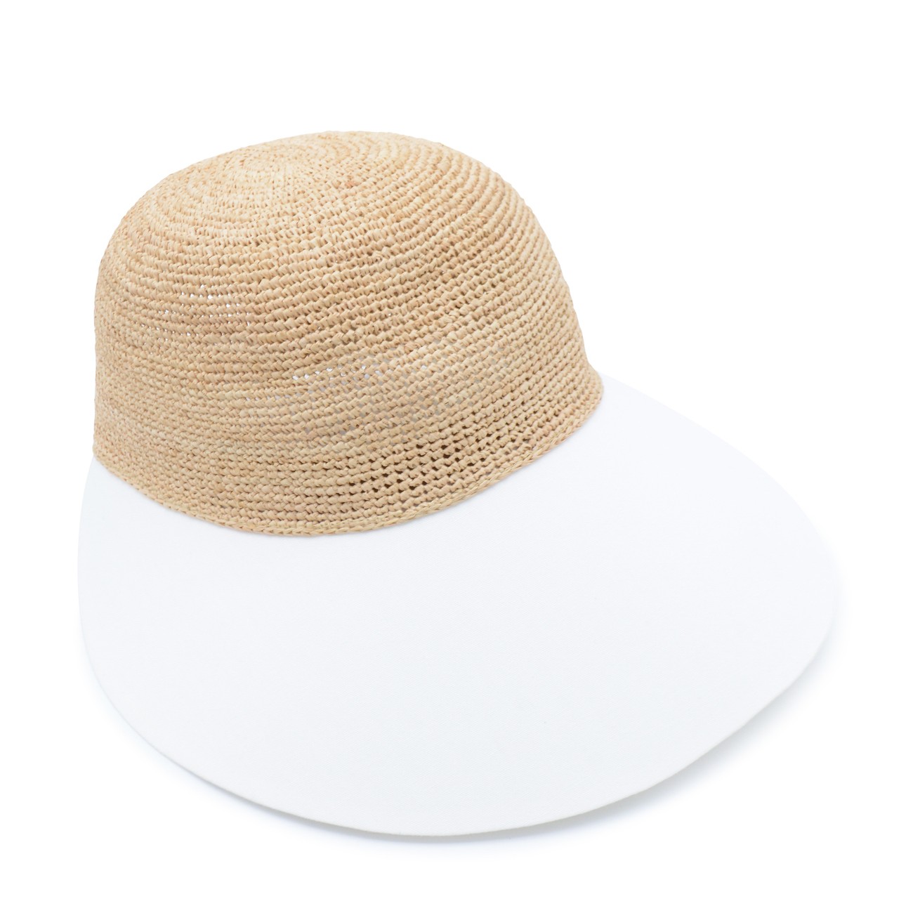 Natural and white raffia hat from Helen Kaminski featuring white curved peak, round crown and flexible edge.