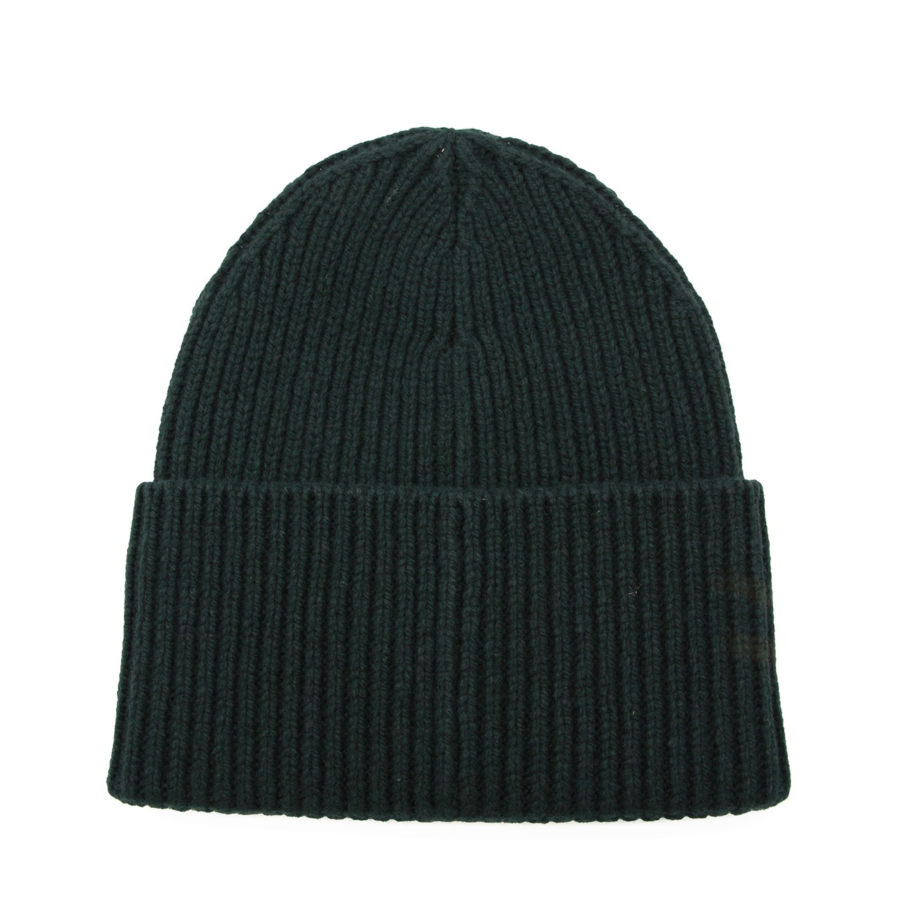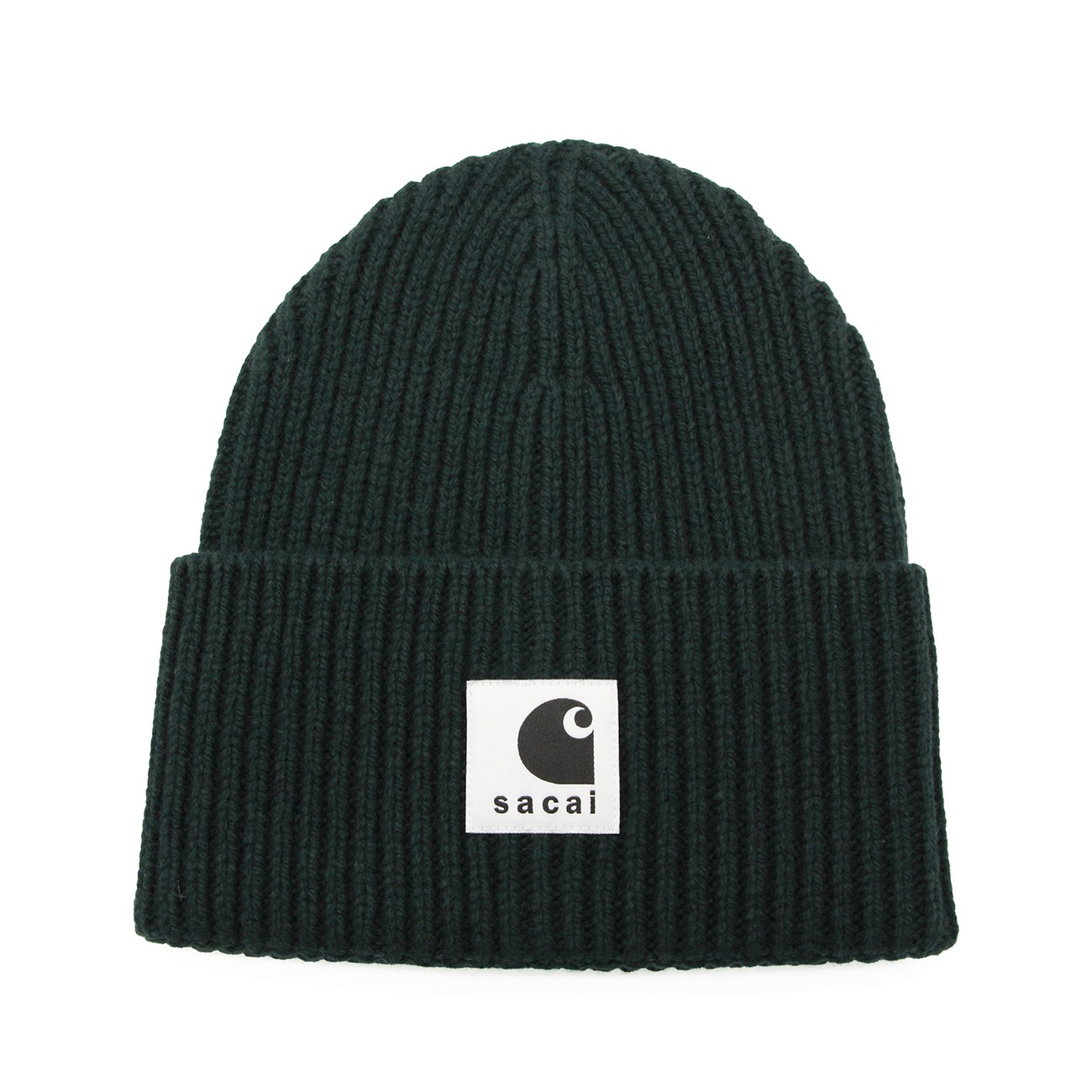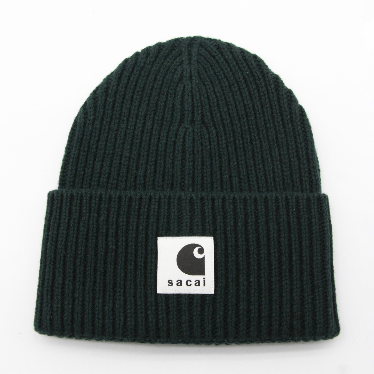 Dark green wool hat from Sacai Carhartt featuring ribbed trim and logo patch.
