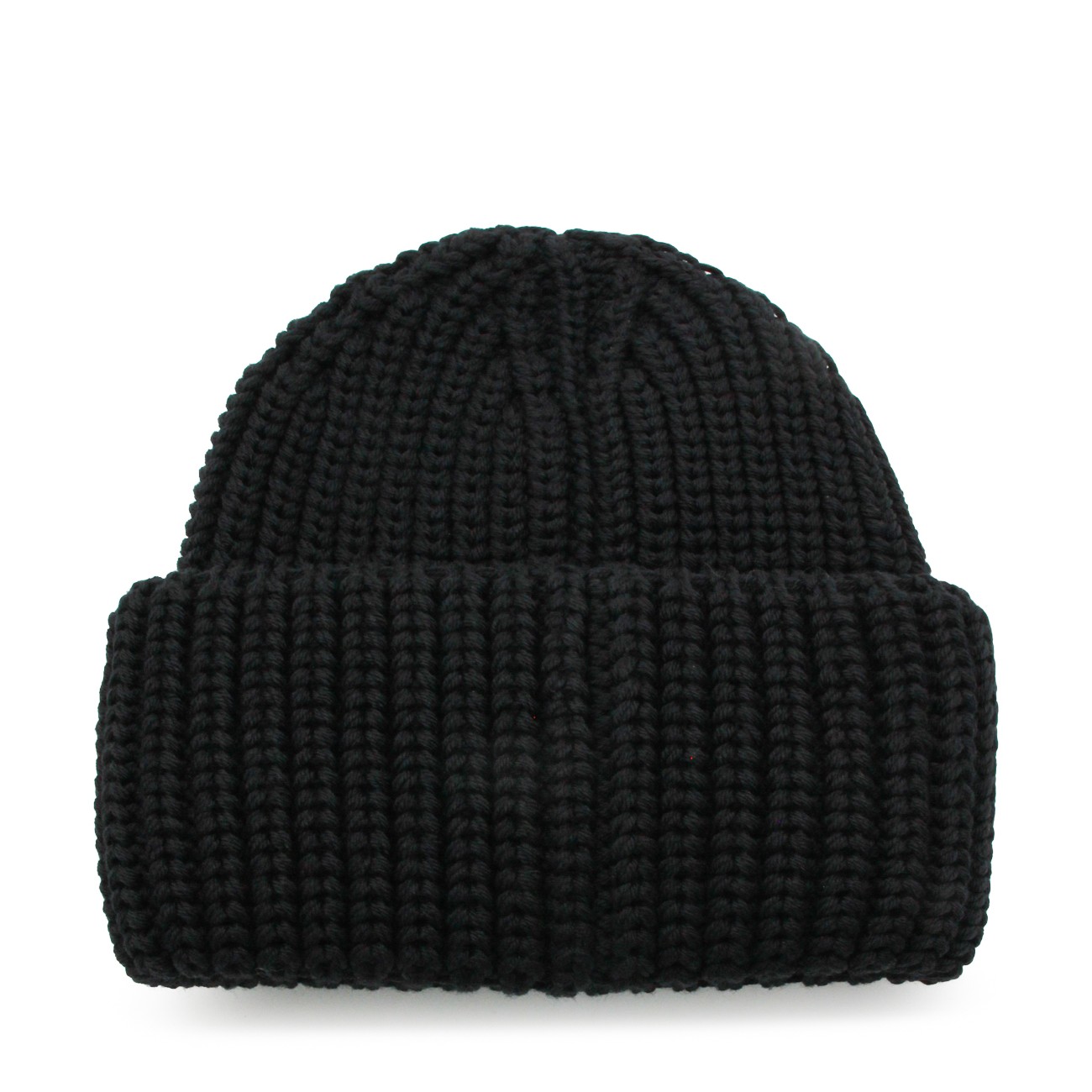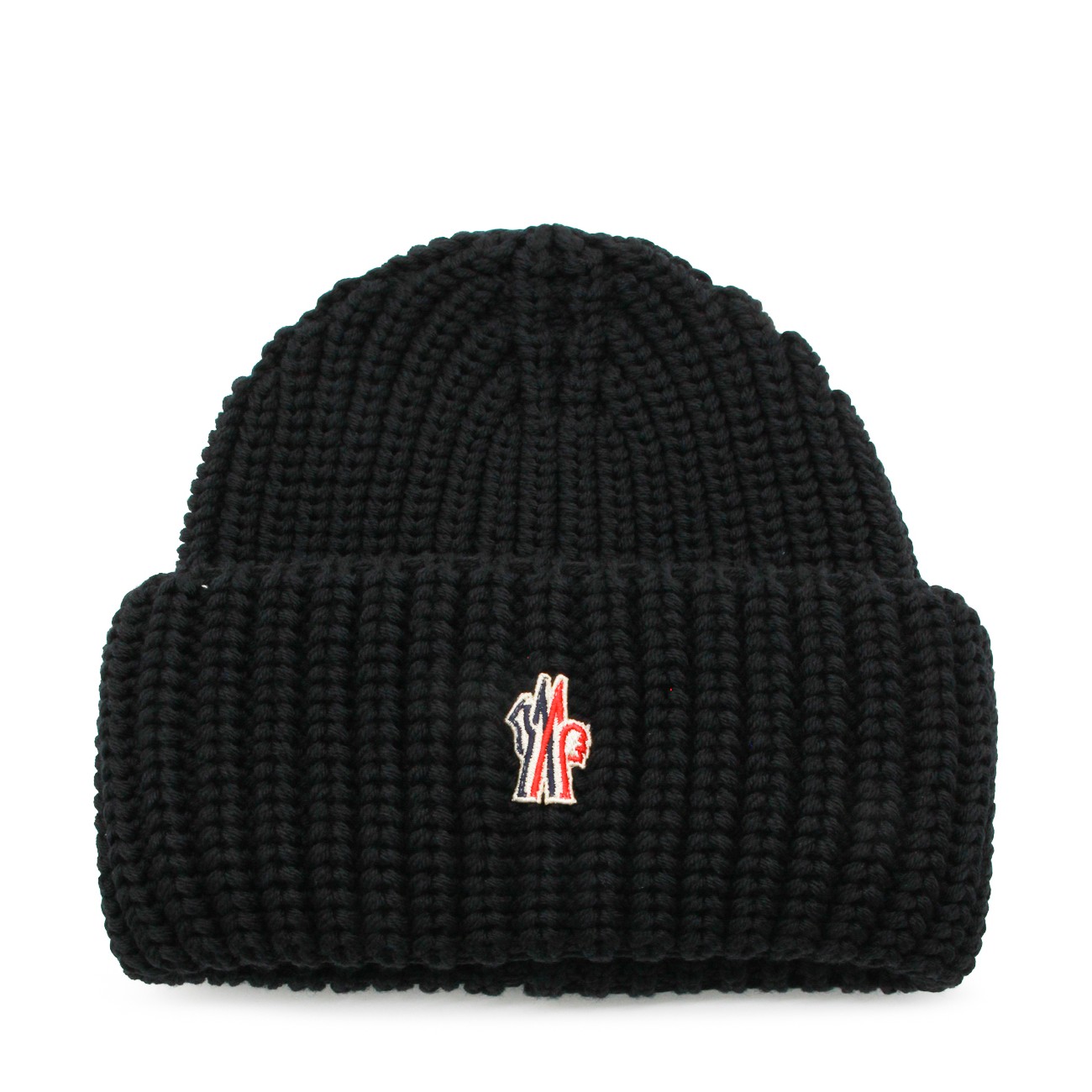 Black wool hat from Moncler Grenoble featuring ribbed trim, frontal logo and regular vestibility.
