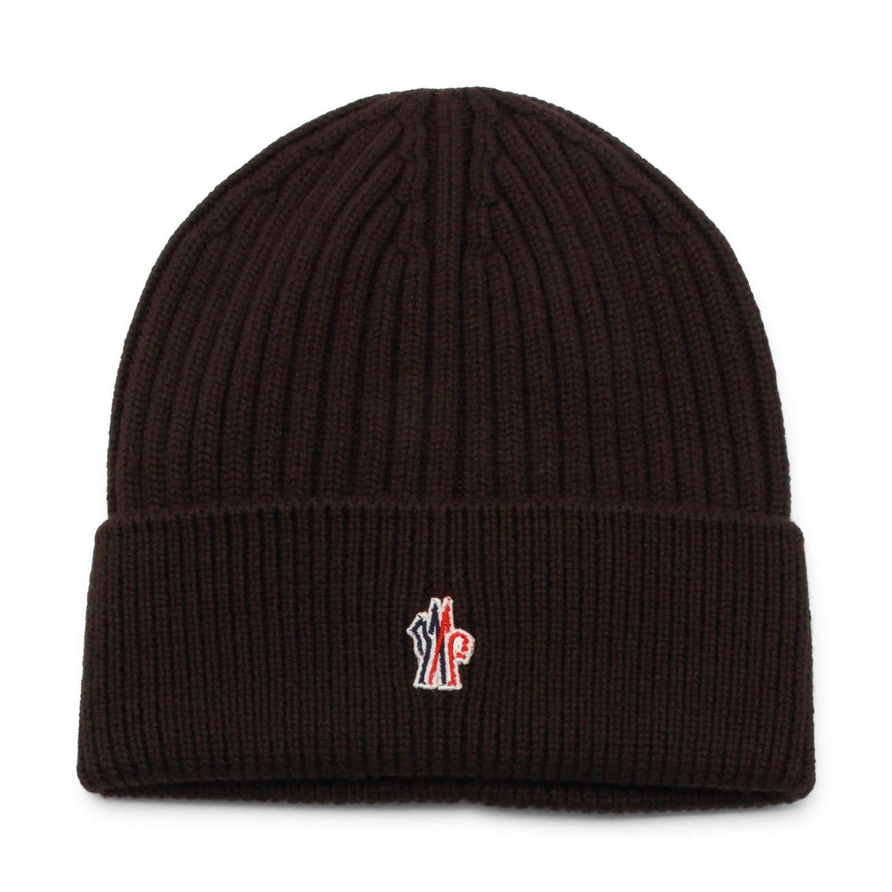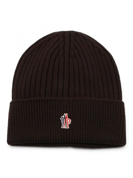 Brown wool beanie from Moncler Grenoble featuring ribbed trim, logo patch and turn-up hem.