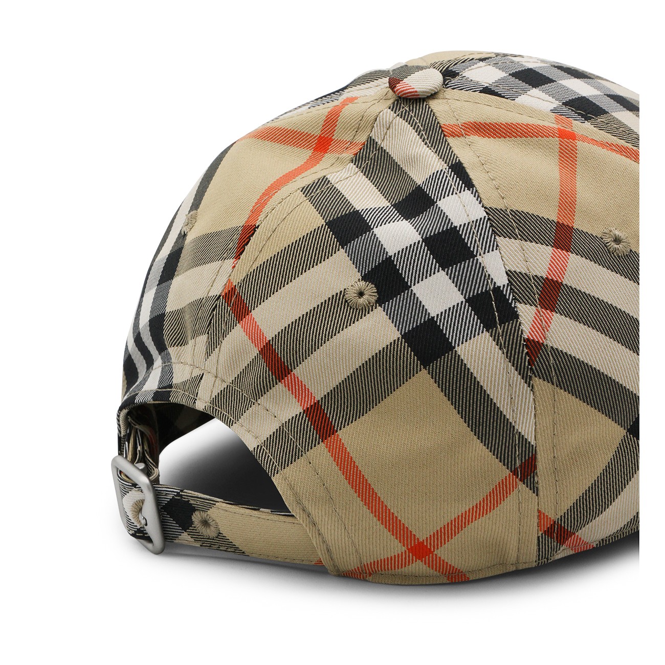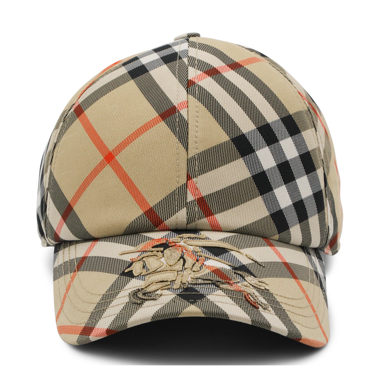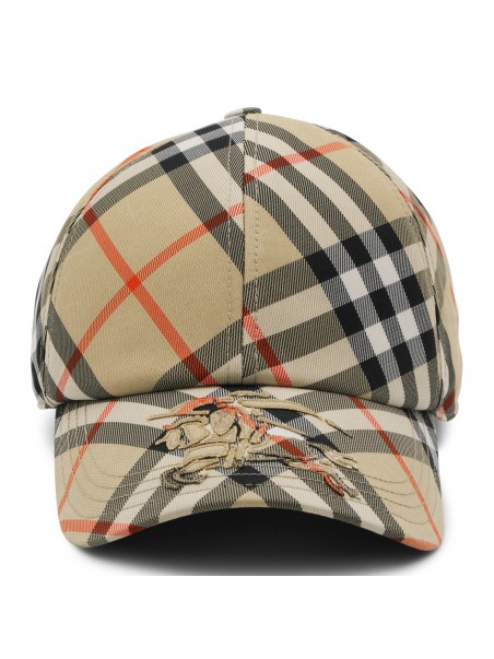 Beige hat from Burberry featuring round trim, logo patch, all over iconic stamp and adjustable size.