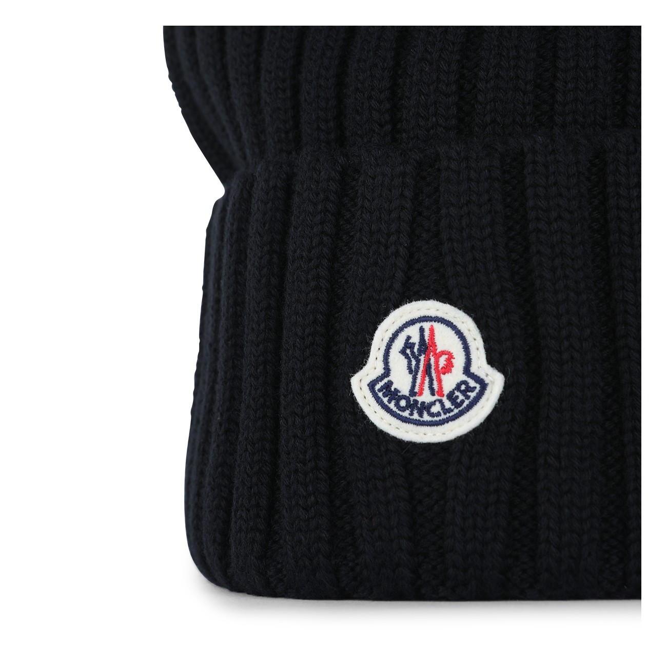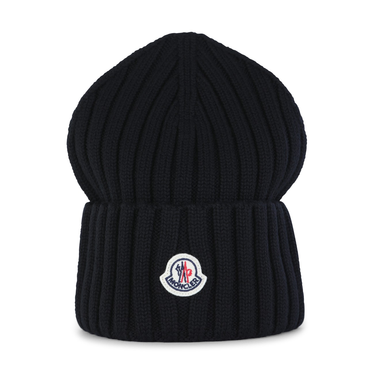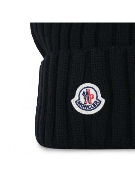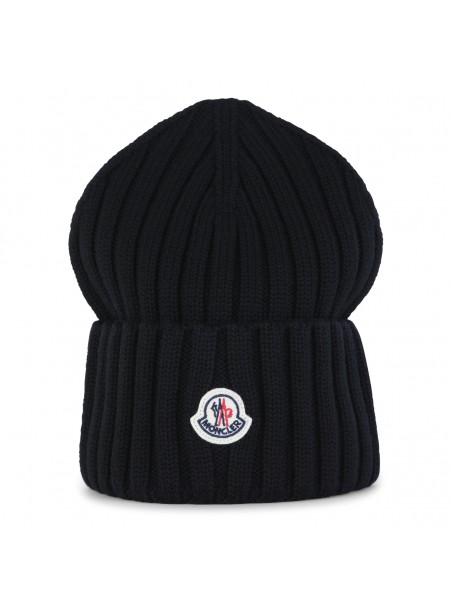 Black cashmere hat from Moncler featuring ribbed trim, logo patch and regular vestibility.