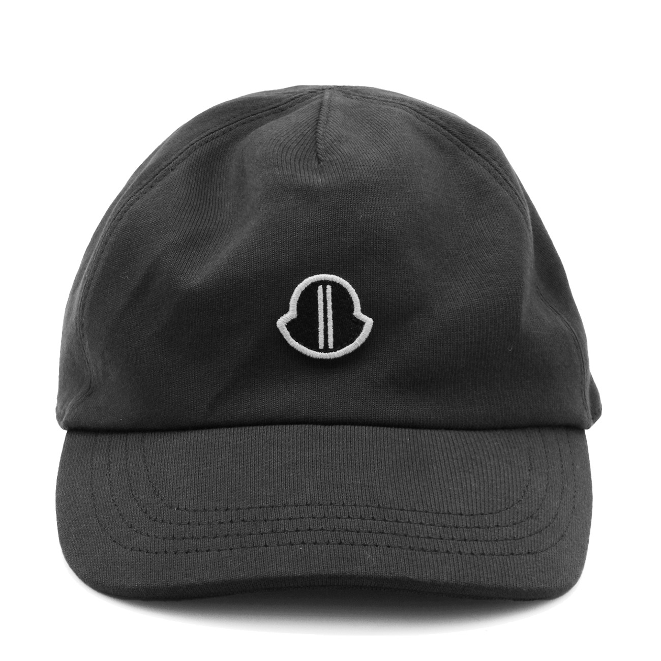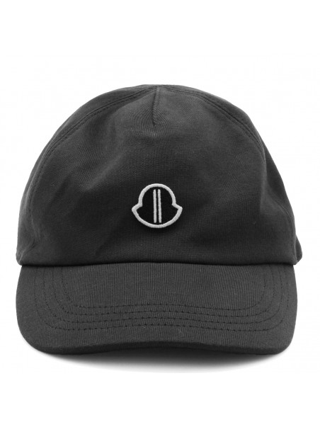 Black cotton hat from Moncler + Rick Owens featuring adjustable tab closure on the back and embroidered logo.