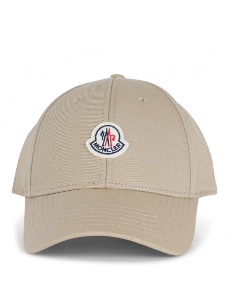 Beige cotton hat from Moncler featuring round trim, adjustable size and logo patch.