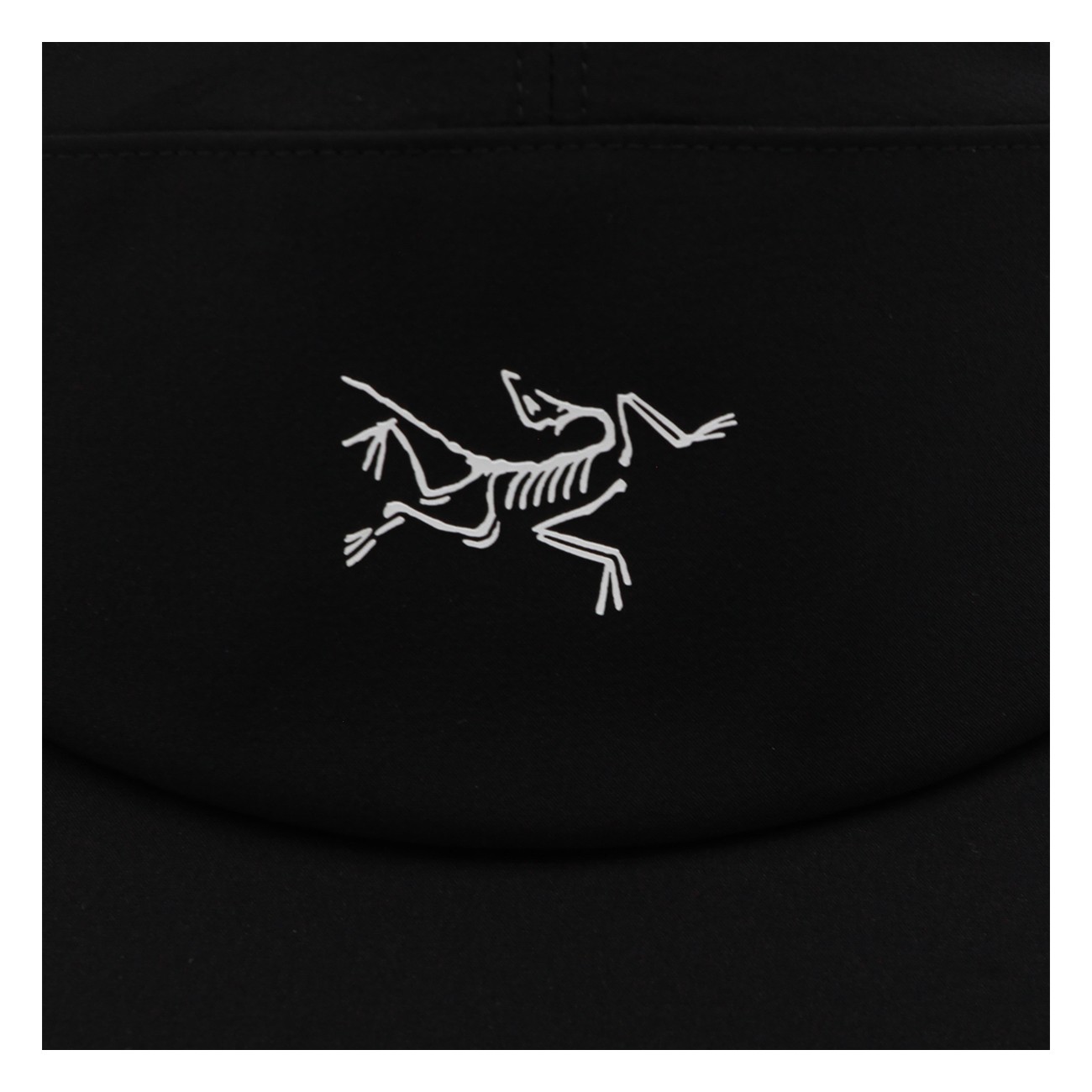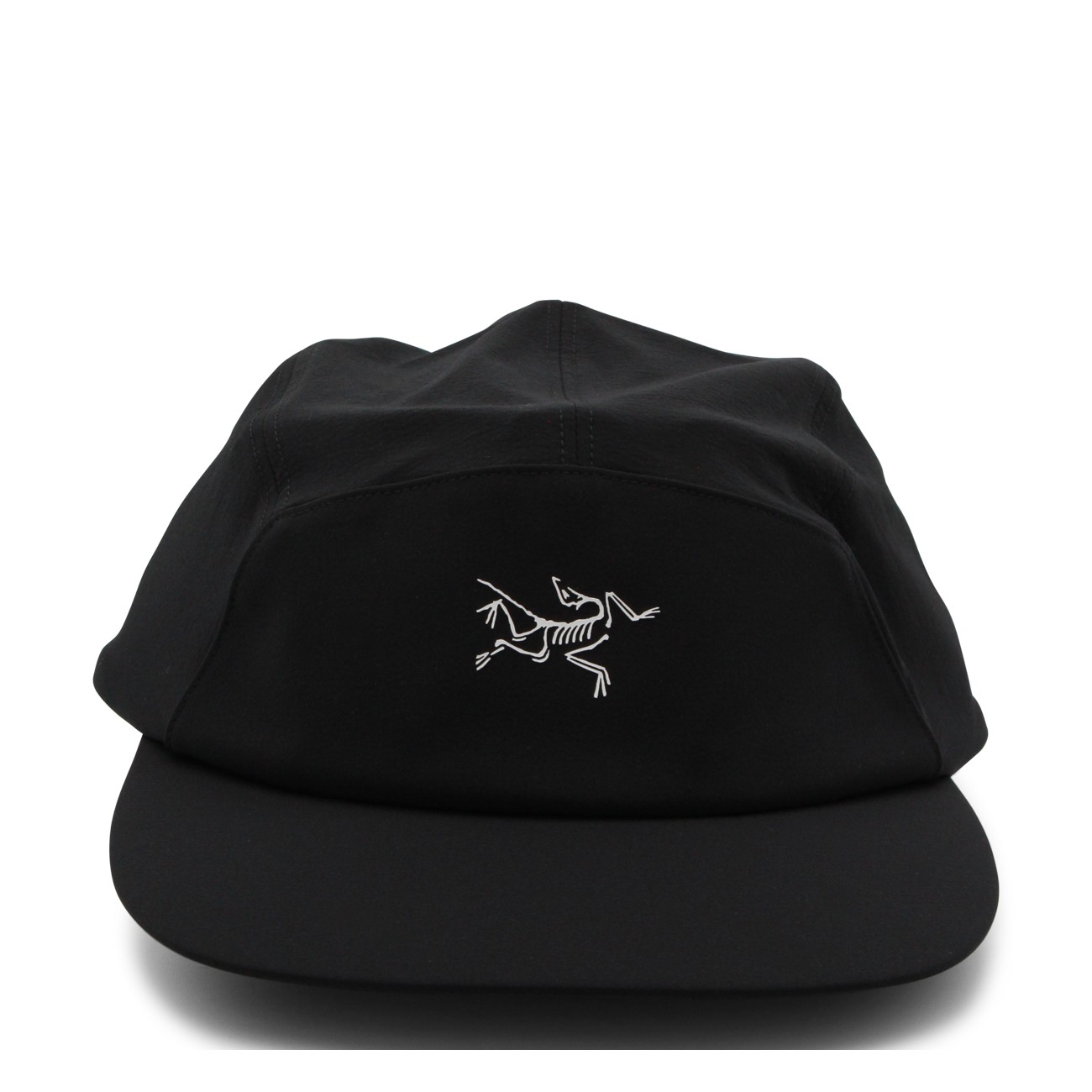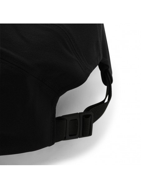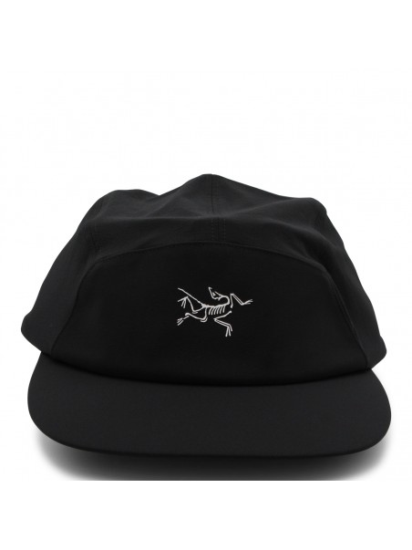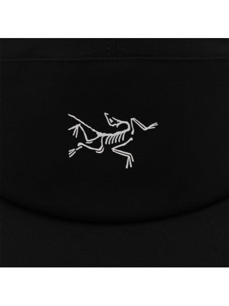 Black and arctic silk Gamma 5 Panel cap from Arc'Teryx featuring rigid visor, embroidered logo detail at front and adjustable closure at back.