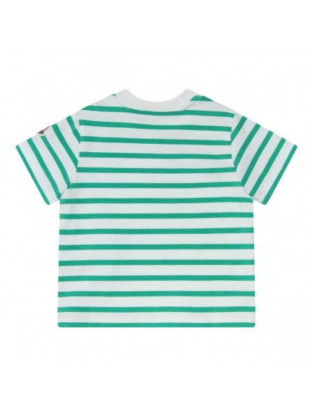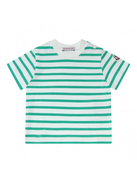 White and green cotton blend T-shirt from Moncler Kids featuring crew neck, short sleeves, logo patch at the sleeve, all-over stripe detailing and straight hem.