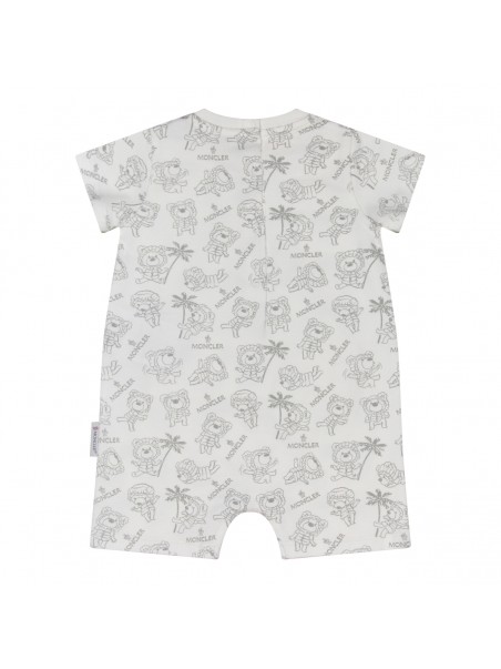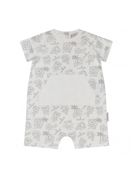 White cotton jumpsuits from Moncler featuring short sleeves, round colla with back fastening, frontal pocket and all over print.
