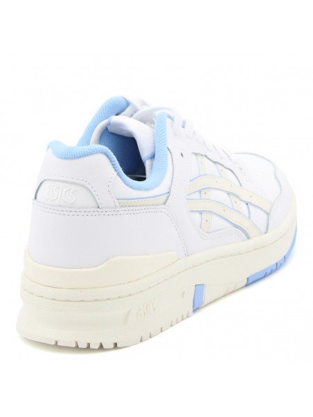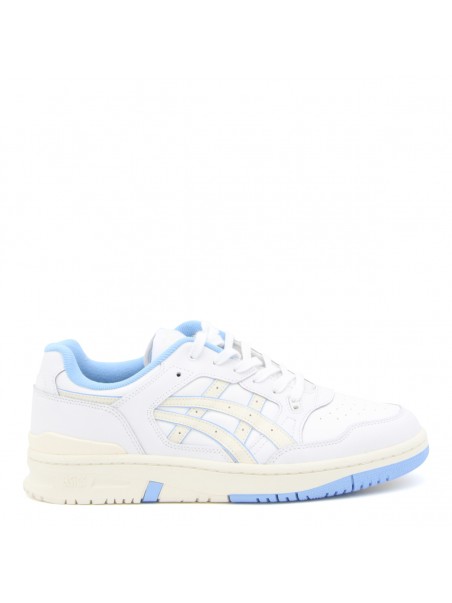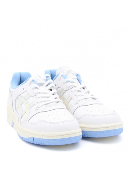 White and lblue leather Court sneakers from Asics featuring rubber sole, leather insole, logo details and round toe.