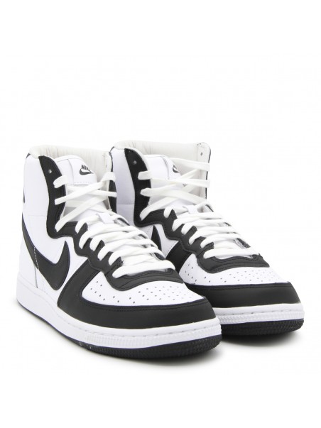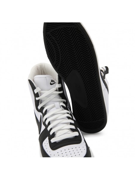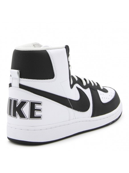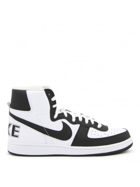 White and black leather sneakers from Comme des Garcons Homme Plus x Nike Terminator featuring round toe, lace-up fastening, front perforated panel, side logo motif, contrast panels and rear logo motif.