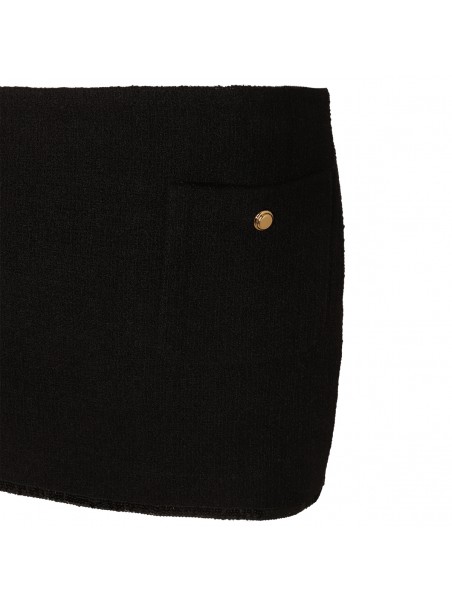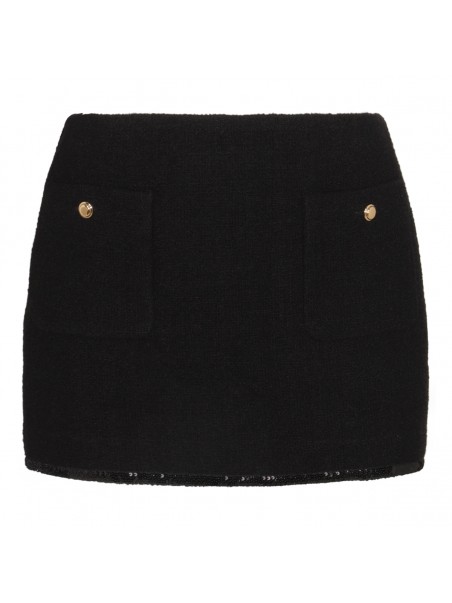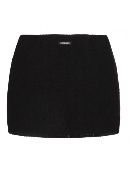 Black wool mini skirt from Miu Miu featuring lateral zip fastening, frontal pockets, mini length and back logo patch.