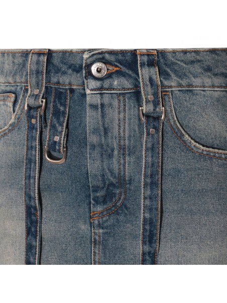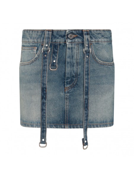 Blue cotton denim skirt from Off-White featuring washed effect, belt loops, two diagonal pockets to the sides, logo patch to the rear, two rear flap pockets, straight hem, silver-tone hardware and button fly fastening.