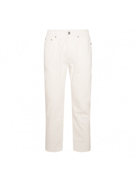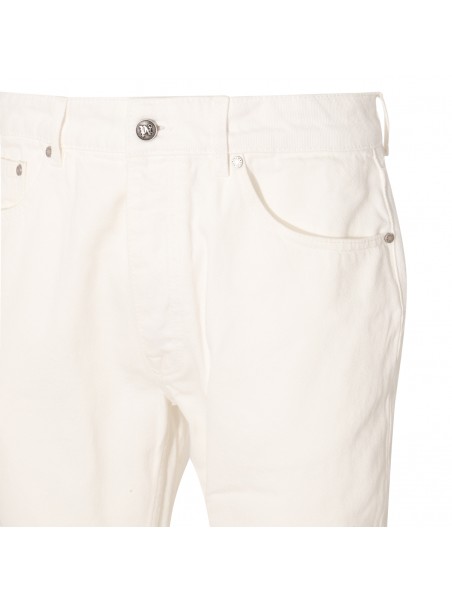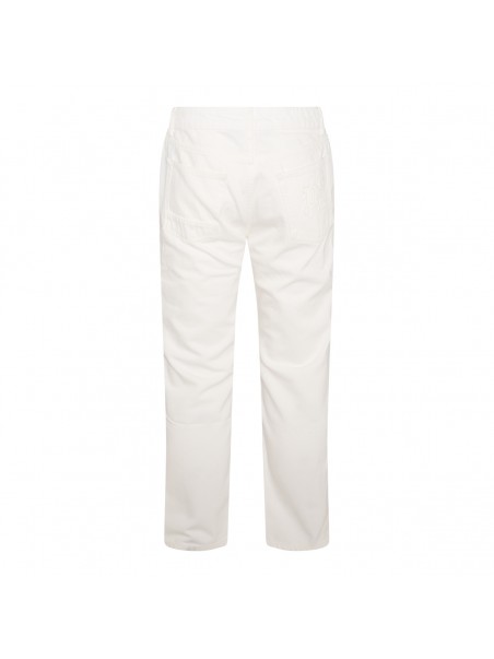Off white cotton jeans from Palm Angels featuring frontal zip and button fastening, belt loops, pockets and regular vestibility.