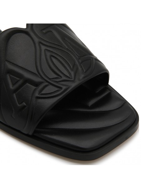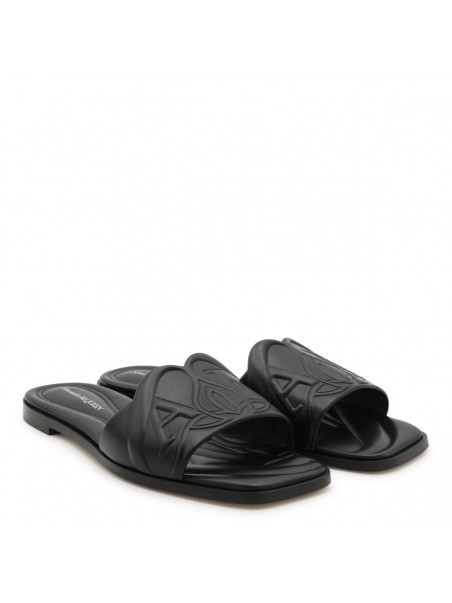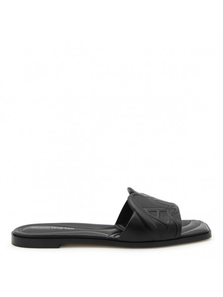 Black leather flats from Alexander McQueen featuring open square toe, embossed logo to the front, branded insole, slip-on style and flat sole.