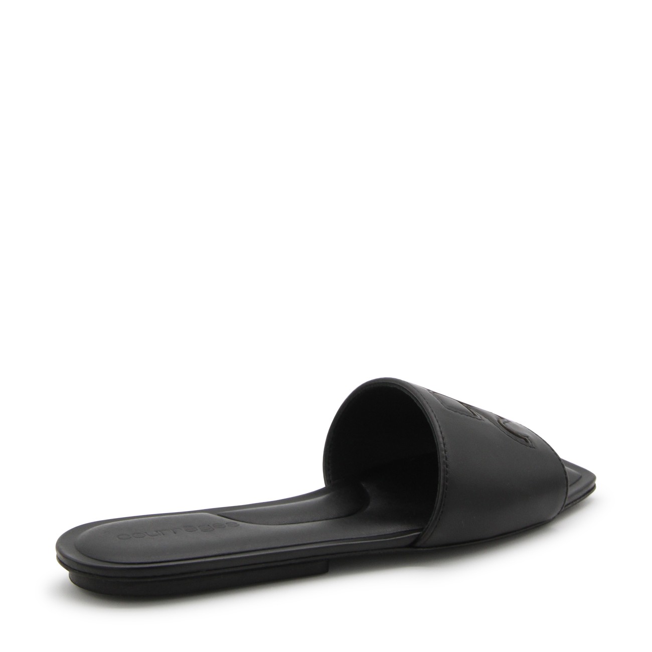 Black leather flats from Courres featuring open square toe, logo patch to the front, slip-on style, branded footbed and flat rubber sole.