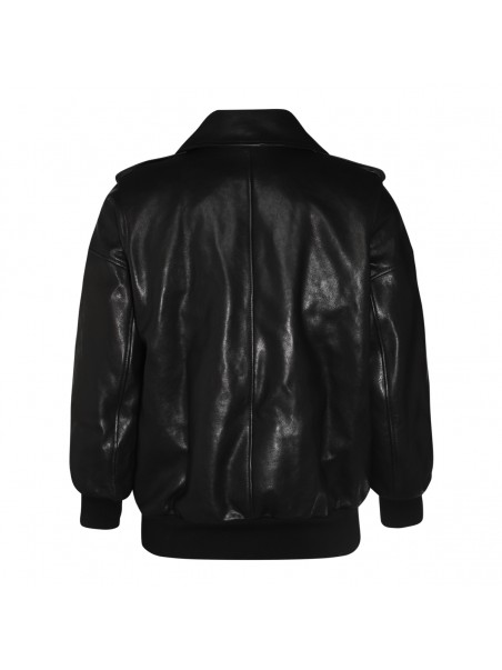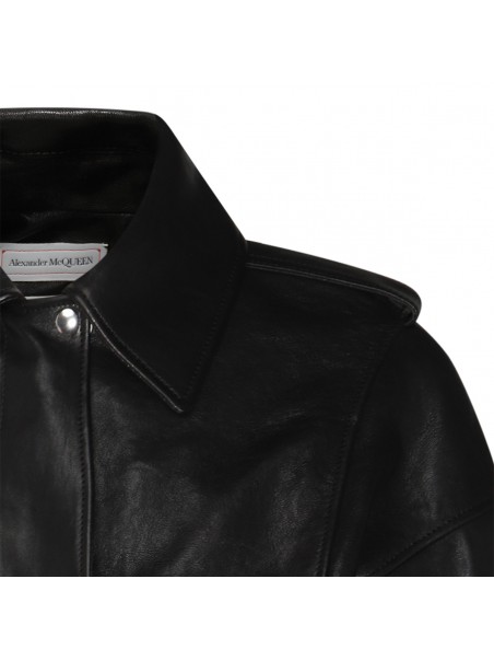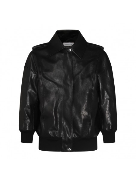 Black leather jackets from Alexander McQueen featuring long sleeves, ribbed cuffs and hem, frontal zip fastening and regular vestibility.