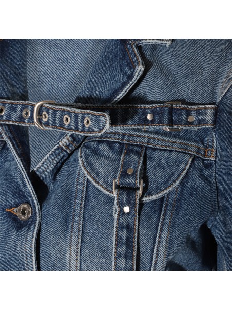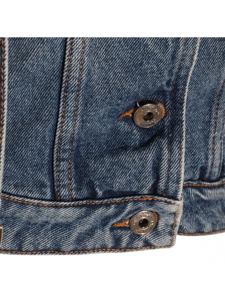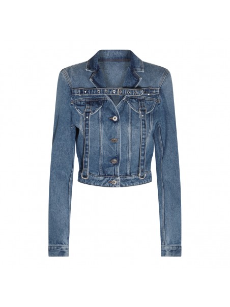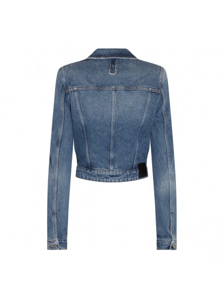 Blue cotton denim jacket from Off-White featuring notched collar, front button placket, long sleeves, buttoned cuffs, two chest flap pockets and straight hem.