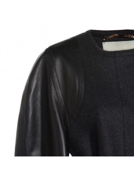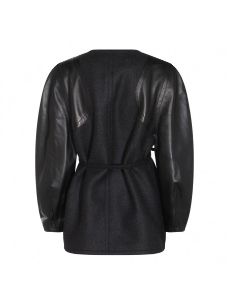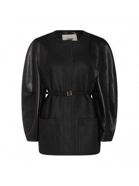 Black leather jacket from Fendi featuring wide long sleeves, crew neckline, fronta closure, belt waist, pockets and regular vestibility.