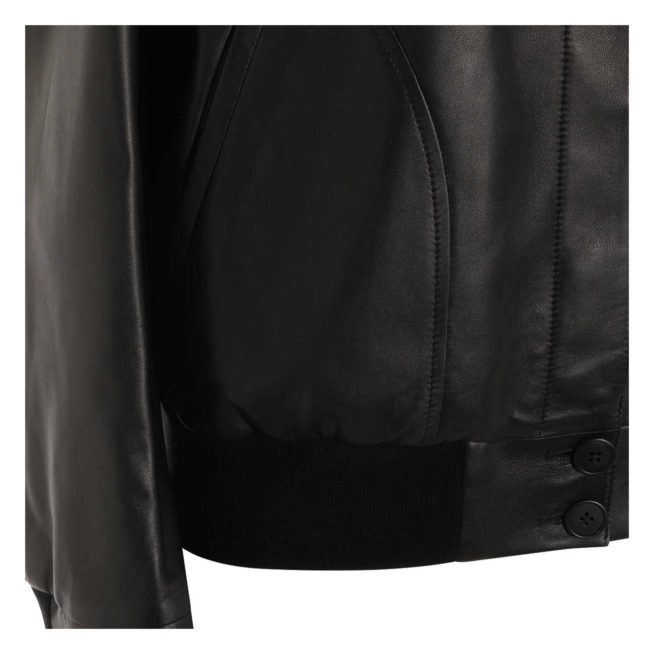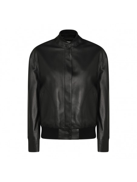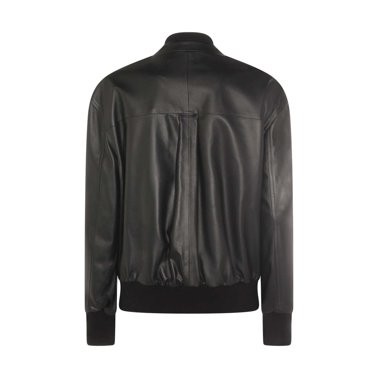 Black leather jacket from The Row featuring high collar, buttons fastening, long sleeves and regular vestibility.