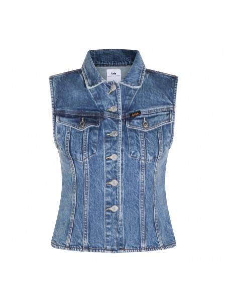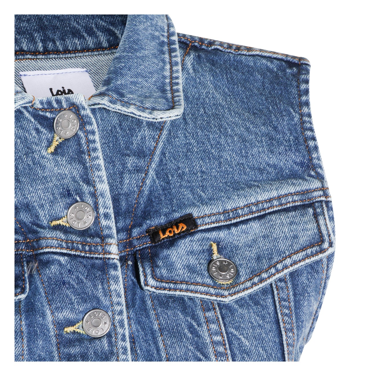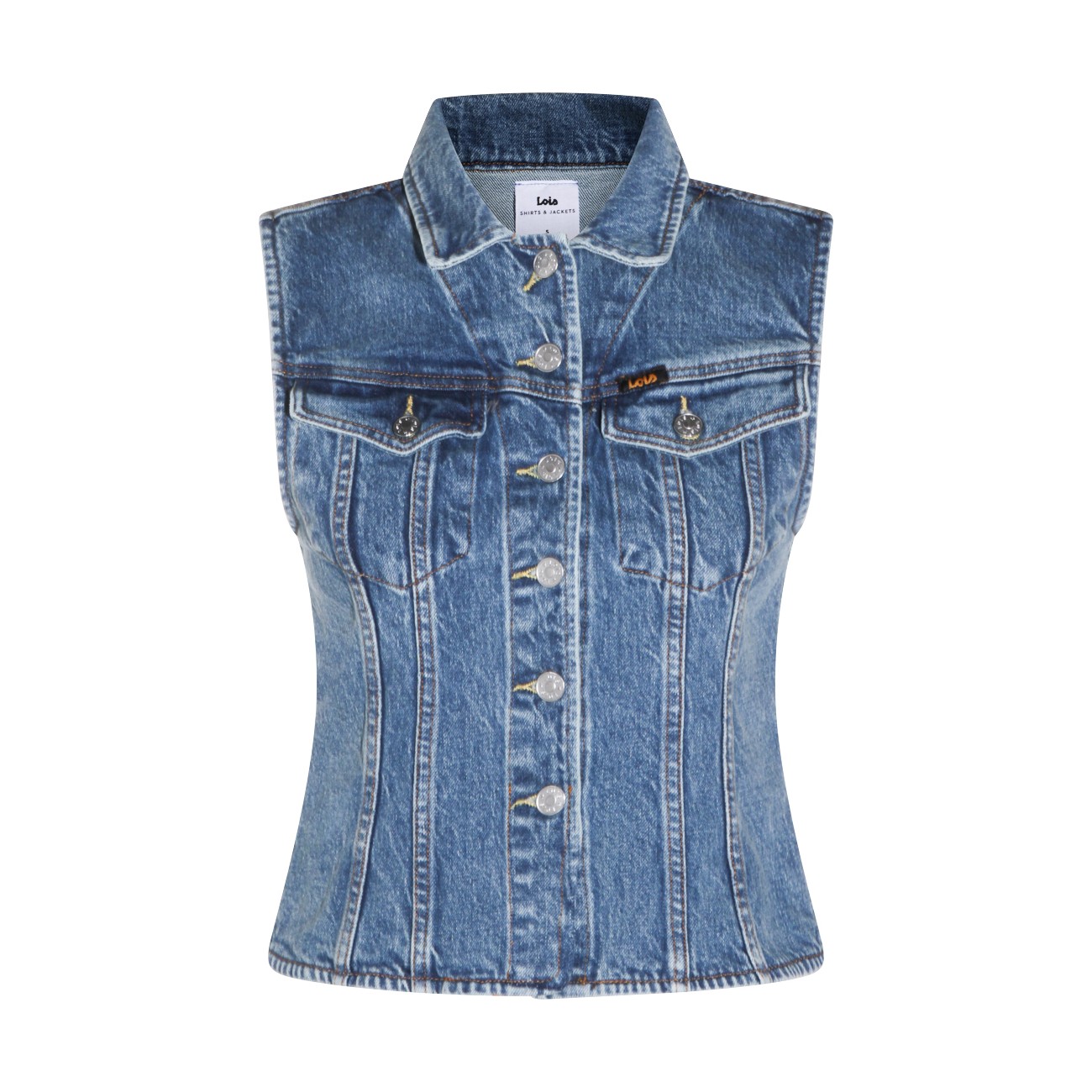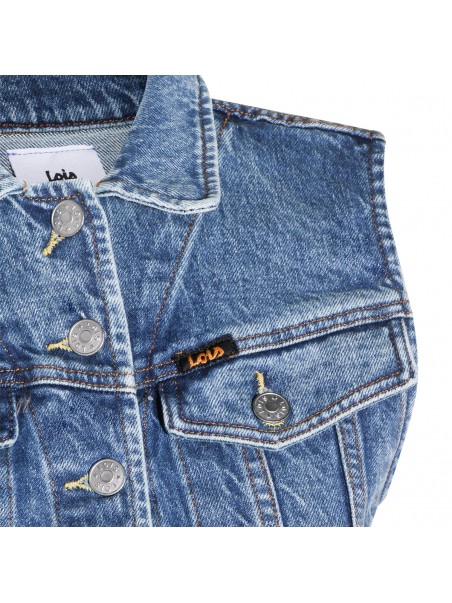 Stone vintage denim Celine vest jacket from Lois Jeans featuring stressed effect, button closure, front chest pockets and logo details.
