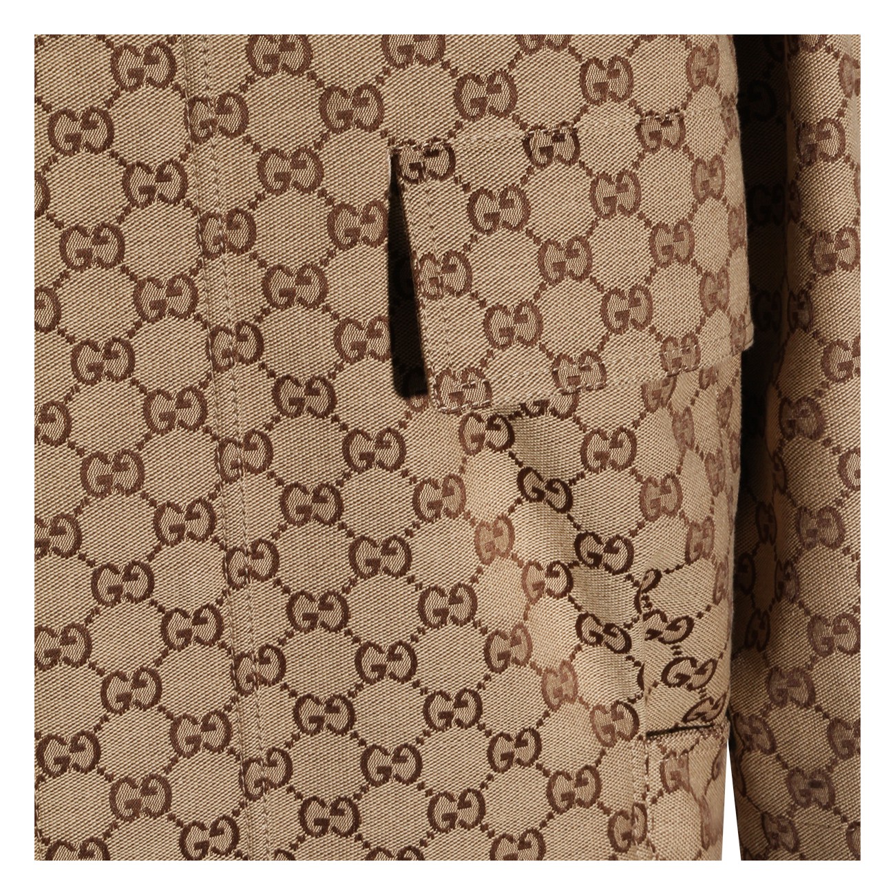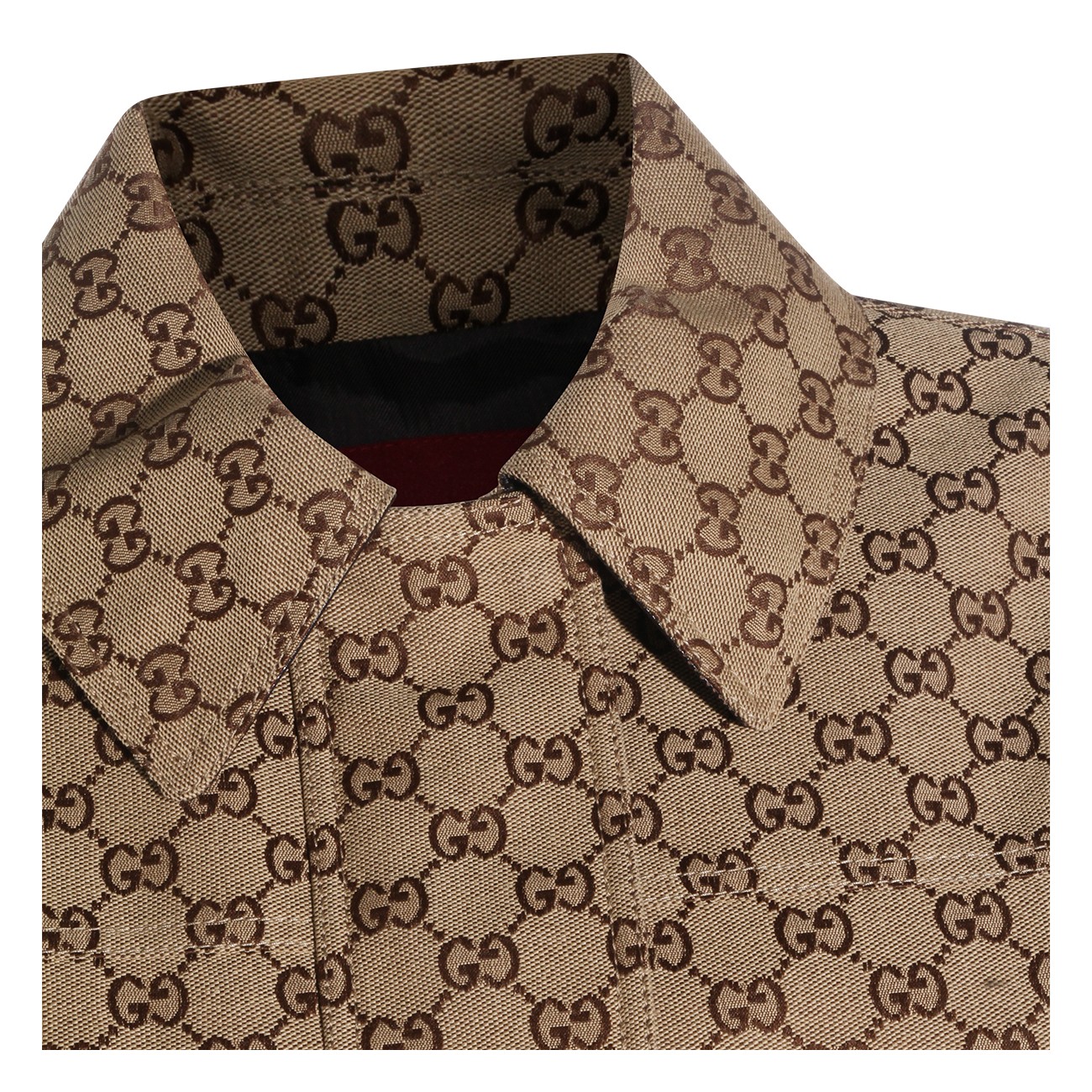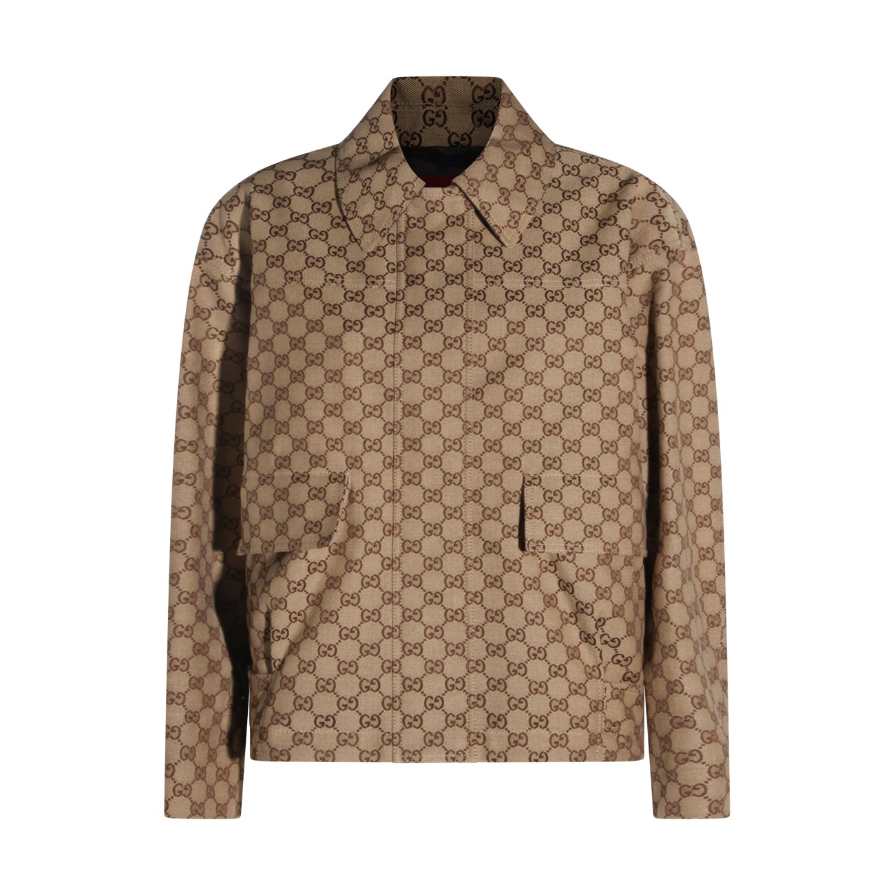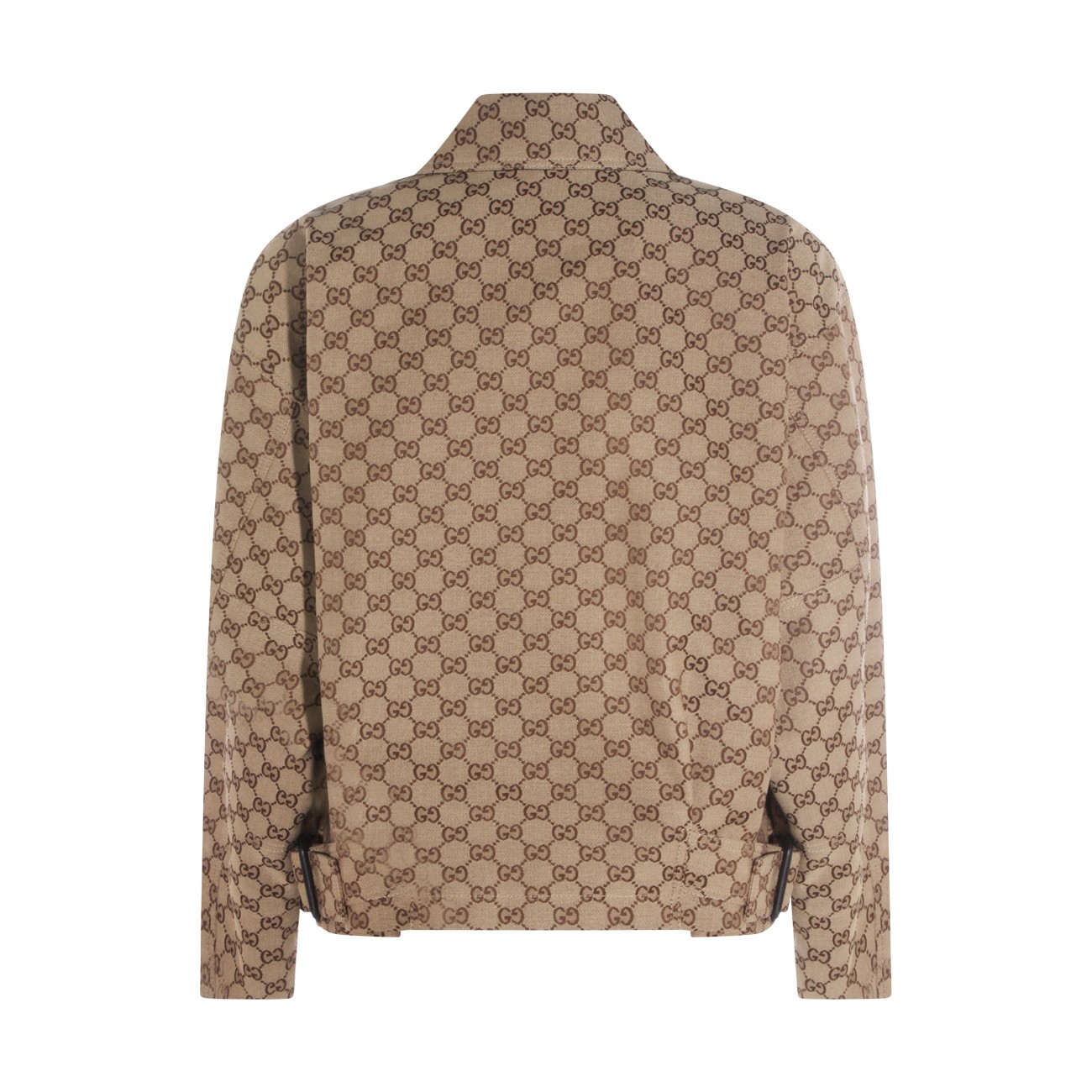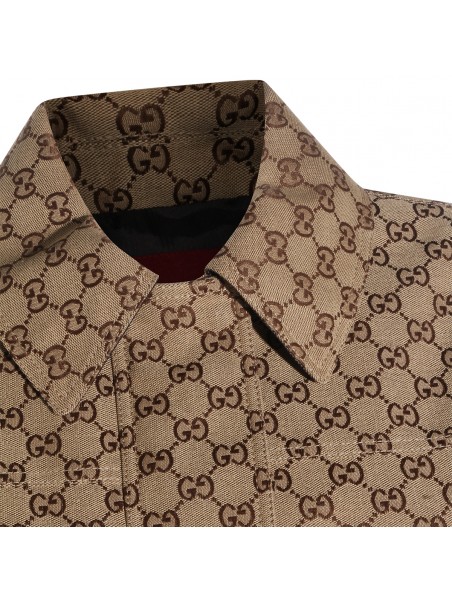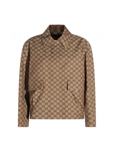 Brown cotton casual jacket from Gucci featuring long sleeves, frontal fastening, all over logo pattern and pockets.