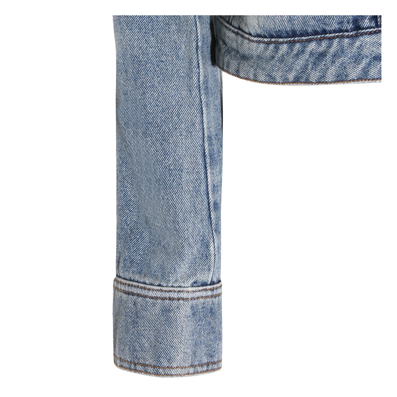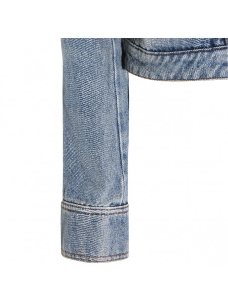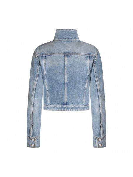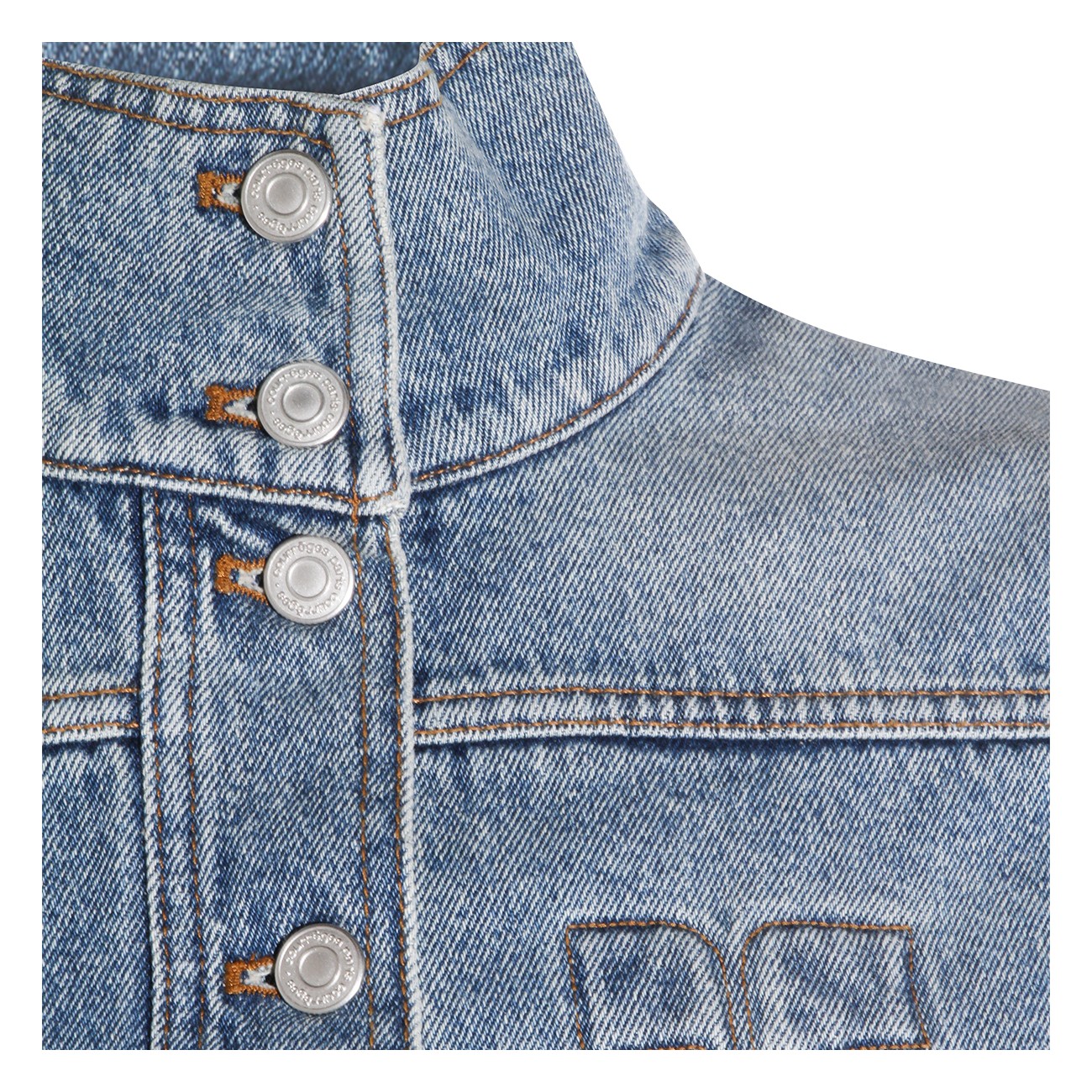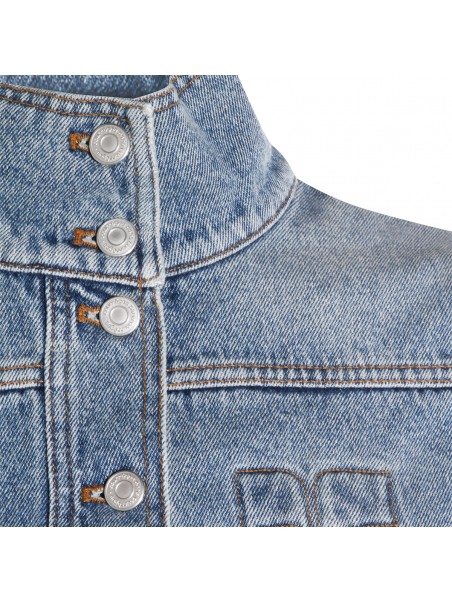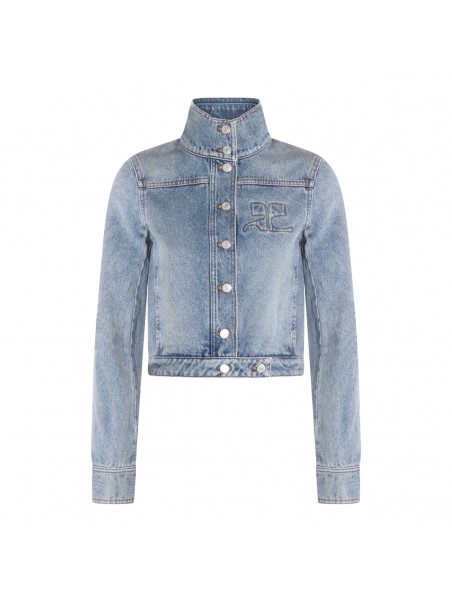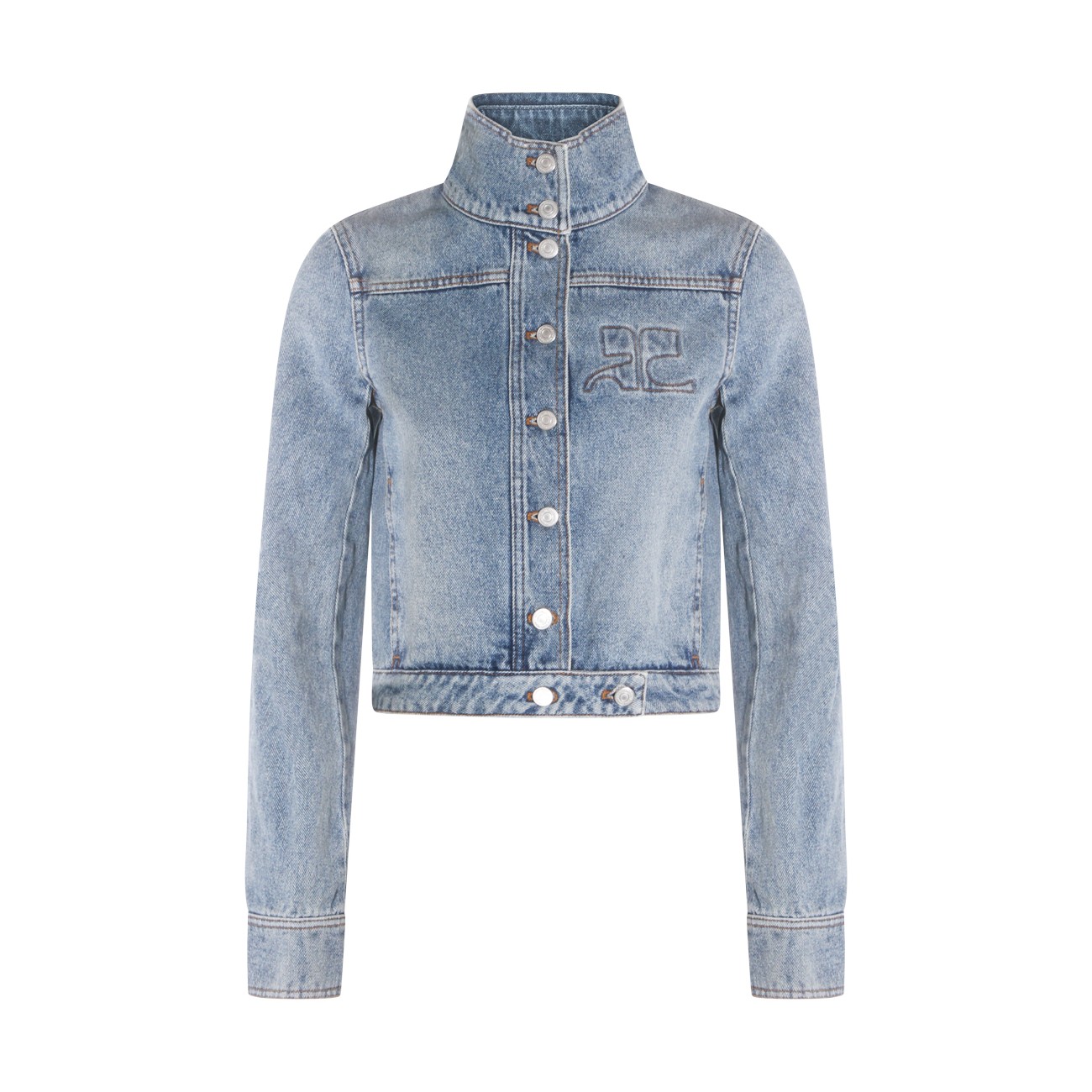 Denim blue cotton denim jacket from Courreges featuring long sleeves, high neck, buttons closure, frontal logo and regular vestibility.