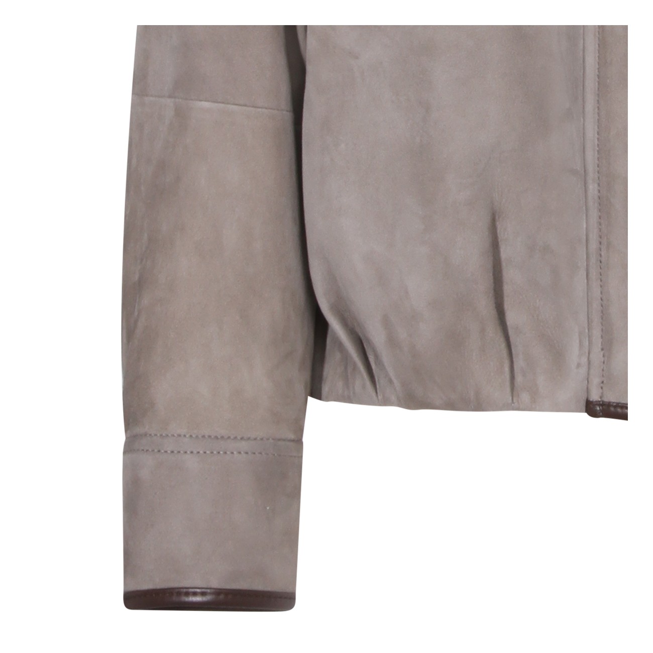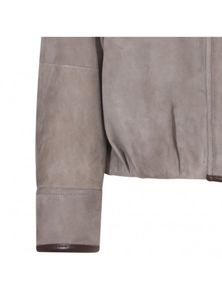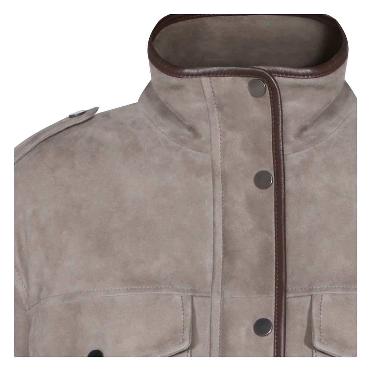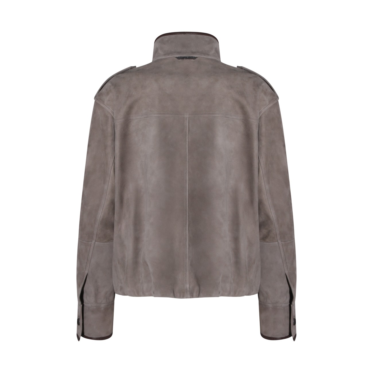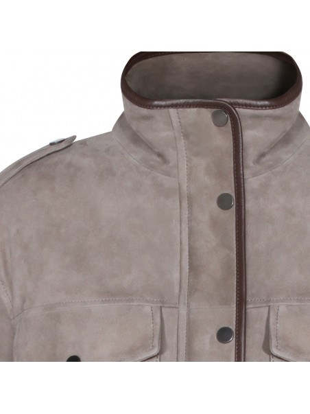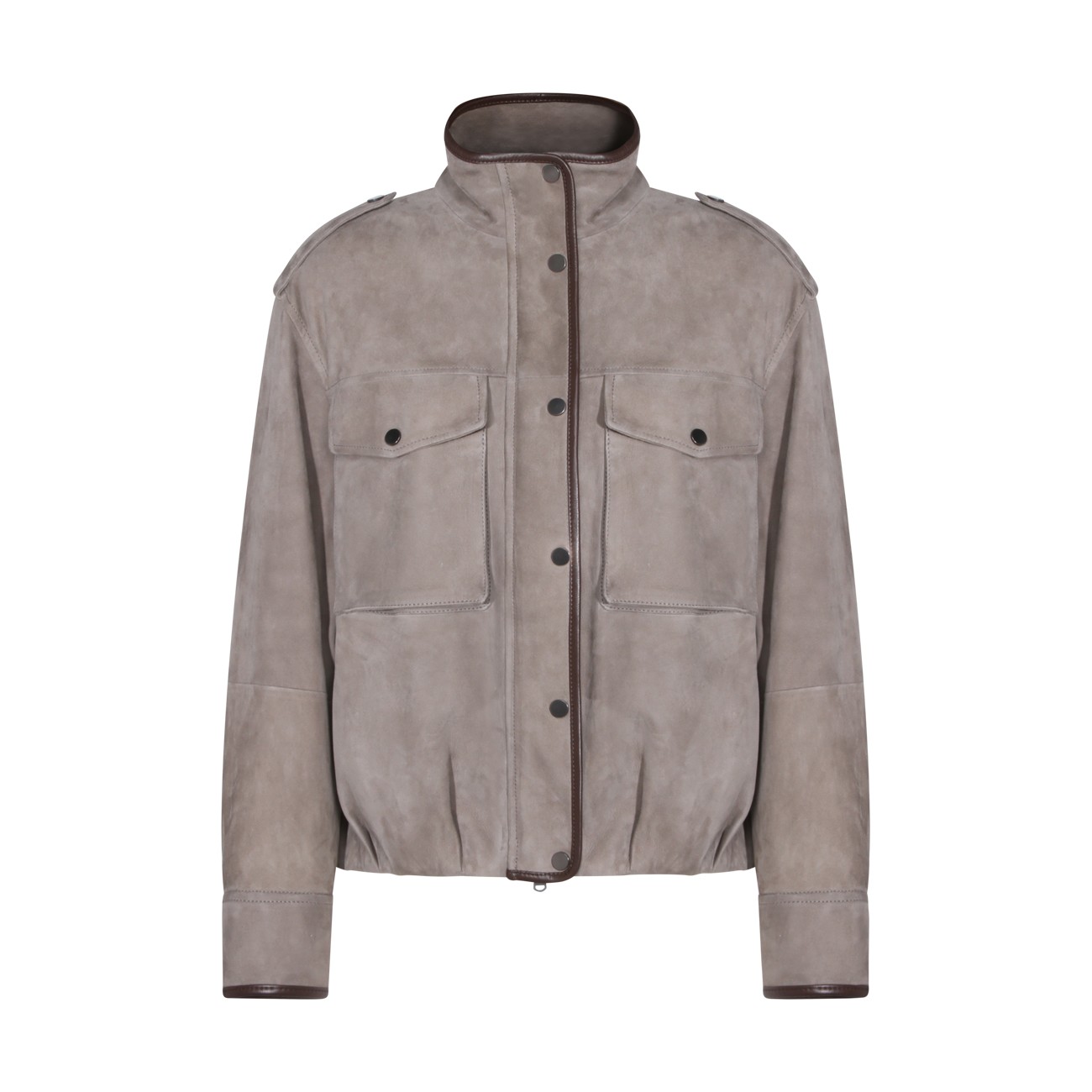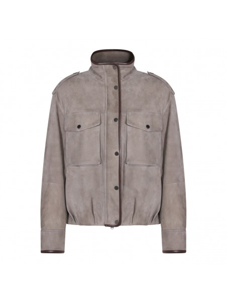 Safari leather jacket from Brunello Cucinelli featuring long sleeves, front chest pockets, magnetic button closure, high neck and ribbed hems.