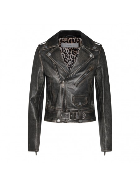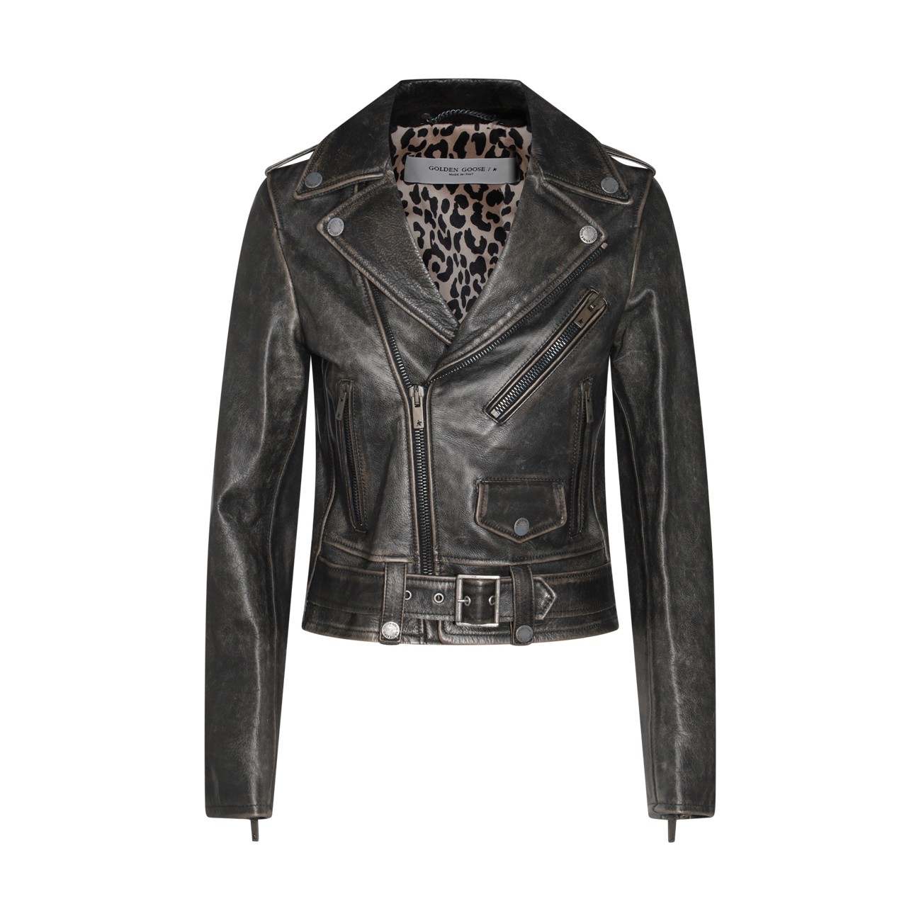 Black leather jacket from Golden Goose featuring frontal zip fastening, buckle, long sleeves and regular vestibility.